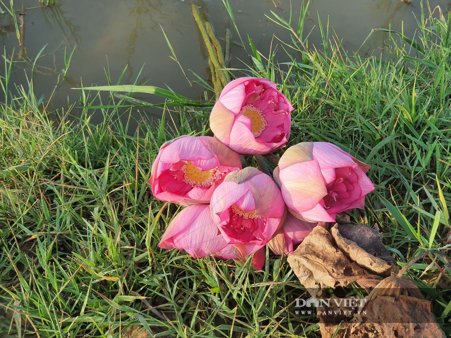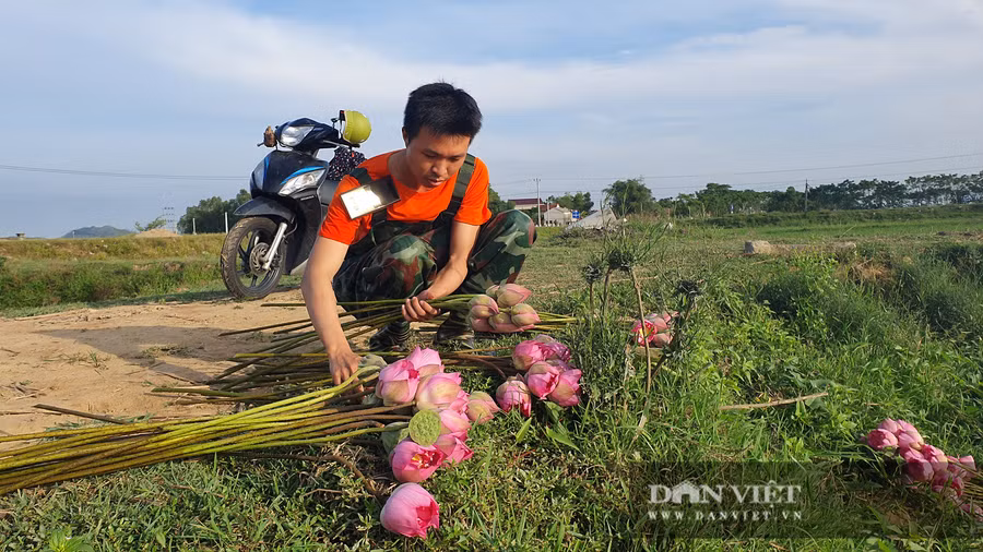 | Được sự hỗ trợ của anh trai, nên từ 5h sáng là hai anh em ra hồ hái sen đê giao cho khách hàng. |