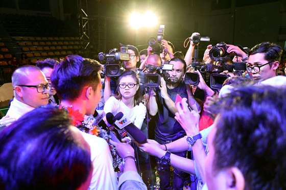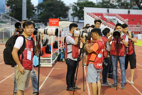 Phóng viên tác nghiệp tại buổi gặp gỡ, giao lưu người hâm mộ cùng đội tuyển bóng đá U23 Việt Nam tại Sân vận động Thống Nhất.