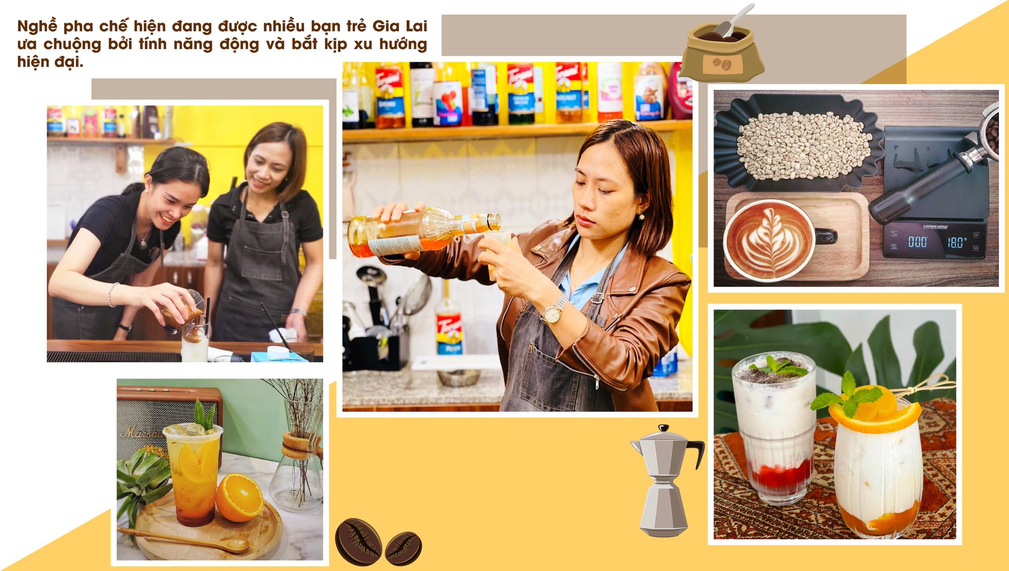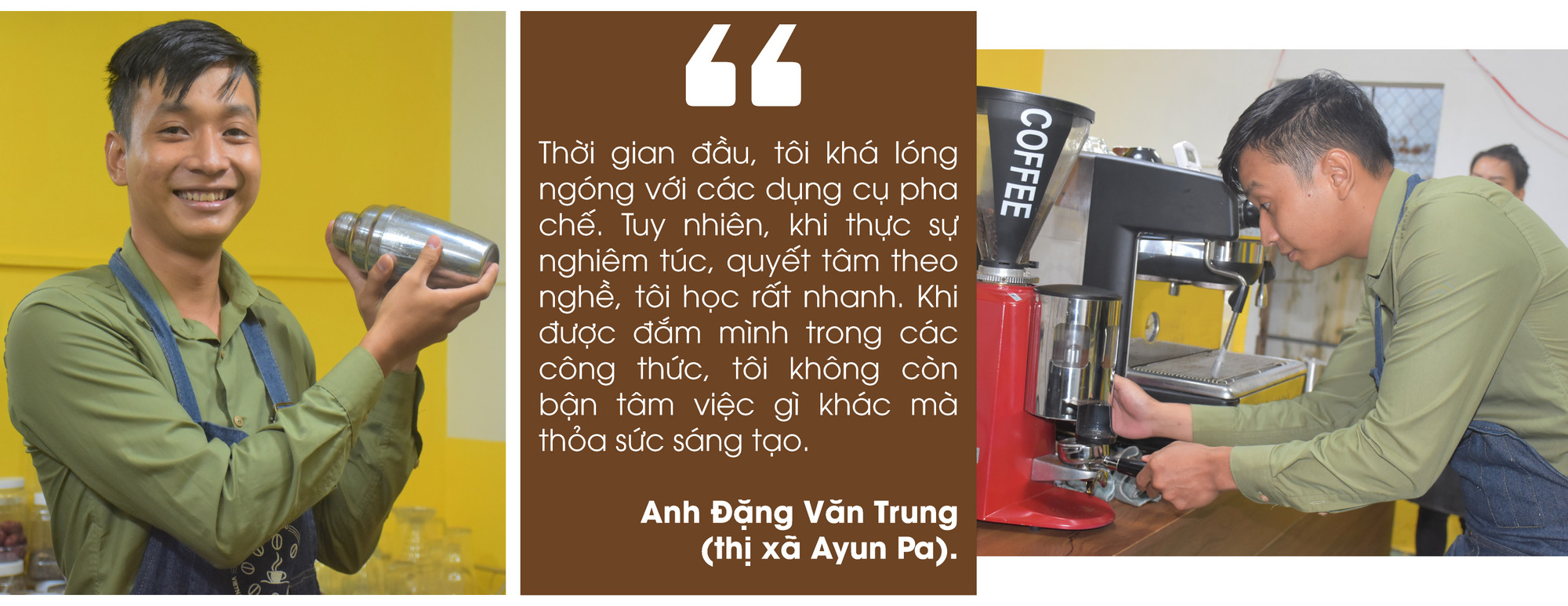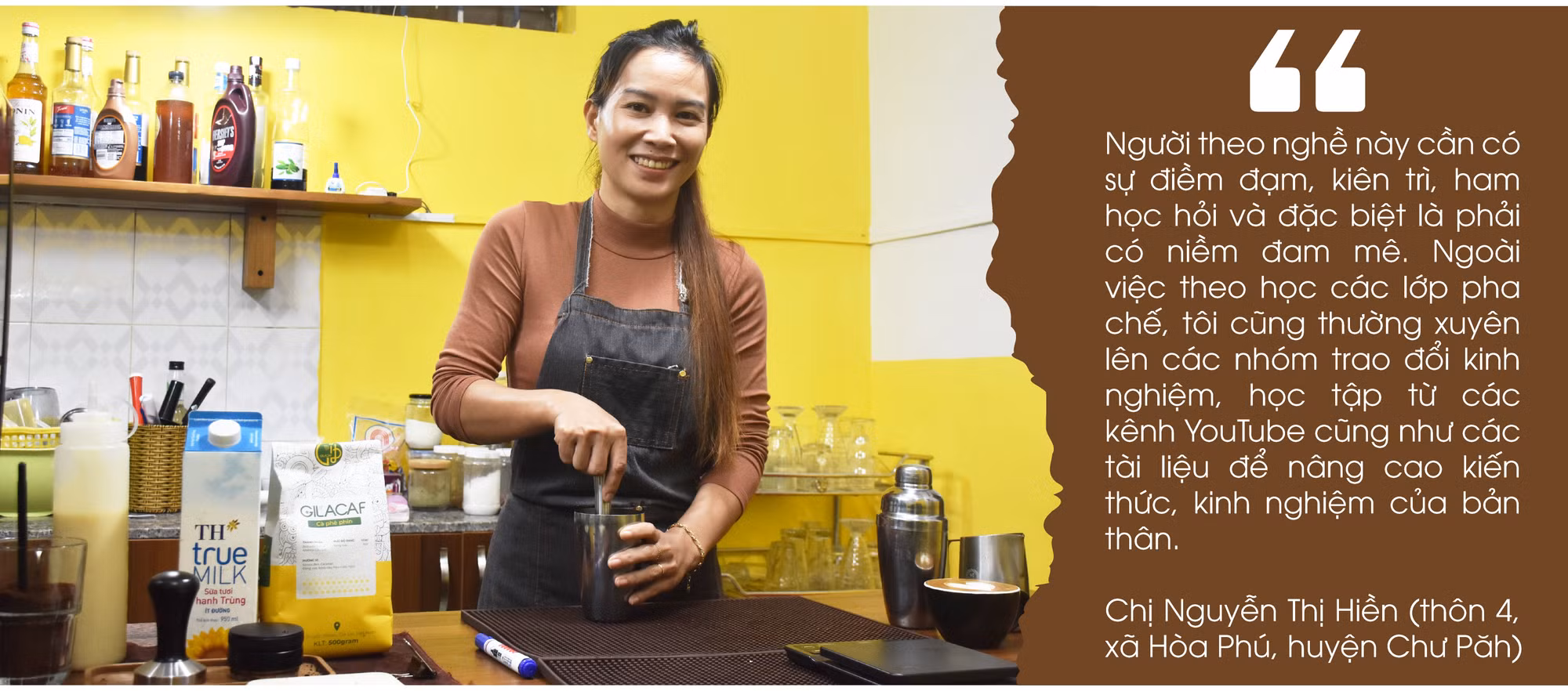 Tương tự, chị Nguyễn Thị Hòa (xã Ia Hiao, huyện Phú Thiện) bộc bạch: “Tôi đến với nghề trong một lần tình cờ gặp anh Dũng. Anh sẵn sàng truyền nghề, hướng dẫn tận tình các bí quyết pha chế. Sau khi nắm bắt các công thức sẵn có, mình phải tự cân chỉnh để có hương vị riêng biệt, không trùng lắp với những nơi khác. Nghề pha chế rèn cho tôi tính kiên nhẫn, sự chỉn chu. Tôi cũng ước mơ có một quán cà phê nhỏ của riêng mình để thỏa mãn niềm đam mê”.