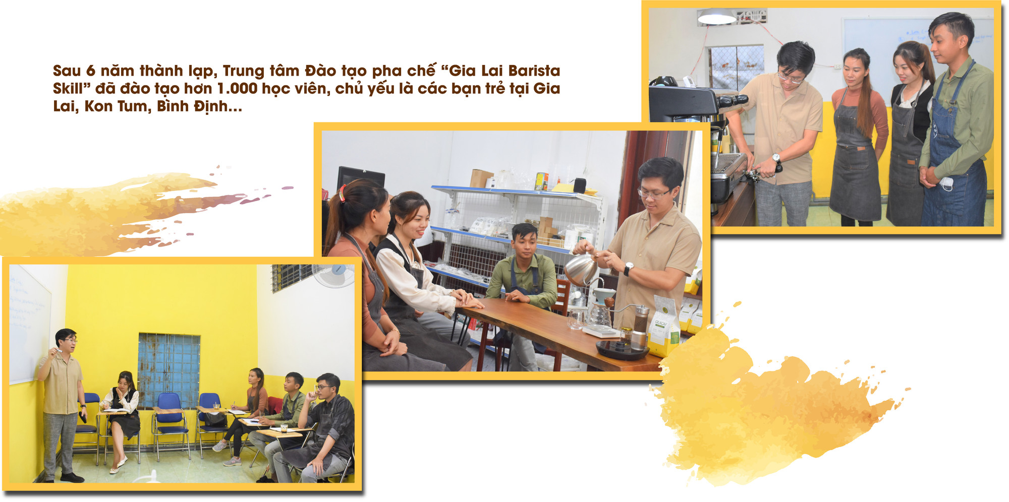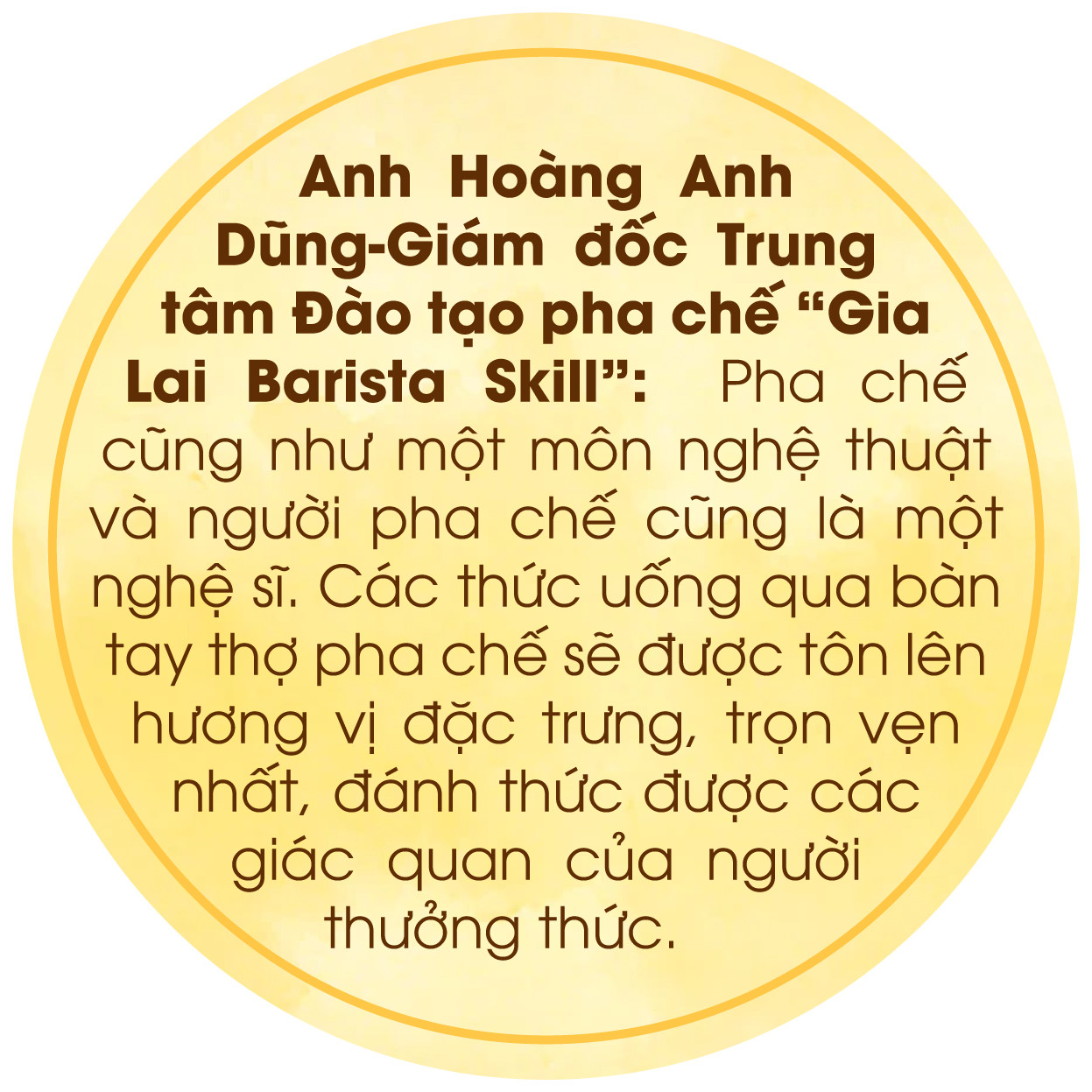 “Muốn trở thành người pha chế giỏi, bạn phải là người có khứu giác lẫn vị giác tinh tế để phân biệt các loại hương liệu và pha chế thức uống phù hợp khẩu vị của thực khách. Đặc biệt, sự nhạy bén về mùi vị là một lợi thế lớn. Bởi vậy, tôi thường có bài phỏng vấn trước để các bạn tới Trung tâm đăng ký học có định hướng đúng với nghề”-anh Dũng chia sẻ. Sau 6 năm thành lập, Trung tâm Đào tạo pha chế “Gia Lai Barista Skill” do anh Hoàng Anh Dũng thành lập và làm Giám đốc đã đào tạo hơn 1.000 học viên, chủ yếu là các bạn trẻ tại Gia Lai, Kon Tum, Bình Định… Hơn thế, Trung tâm đã trực tiếp giới thiệu việc làm cho nhiều học viên sau khi hoàn thành khóa học với thu nhập ổn định.