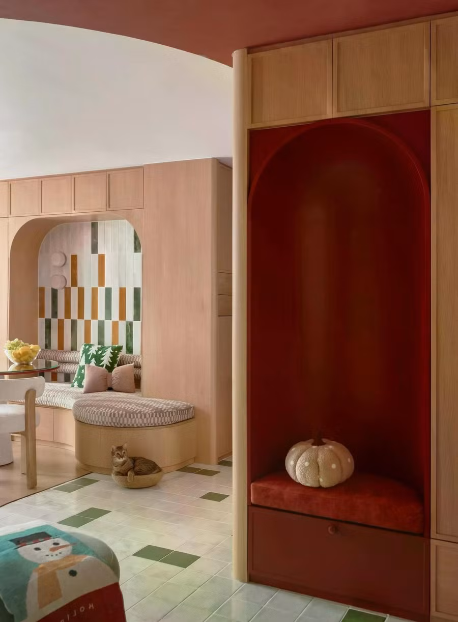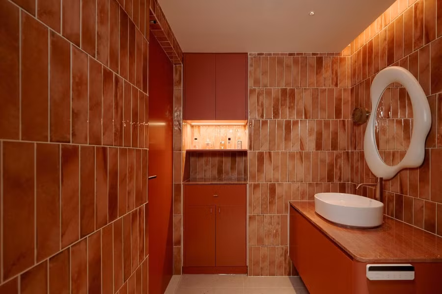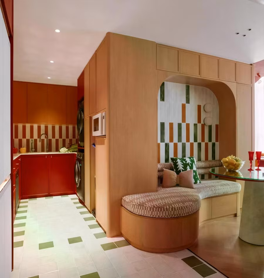 Nếu cấu trúc là bộ khung của căn hộ thì màu sắc chính là linh hồn. Công trình theo đuổi phong cách Color Block kết hợp Mid-Century với bảng màu giàu năng lượng gồm cam gạch, xanh lục, đỏ trầm, hồng pastel và be ấm. Những gam màu tưởng như đối lập được phối hợp đầy kiểm soát, tạo nên tổng thể sinh động, cá tính nhưng không hề rối mắt.