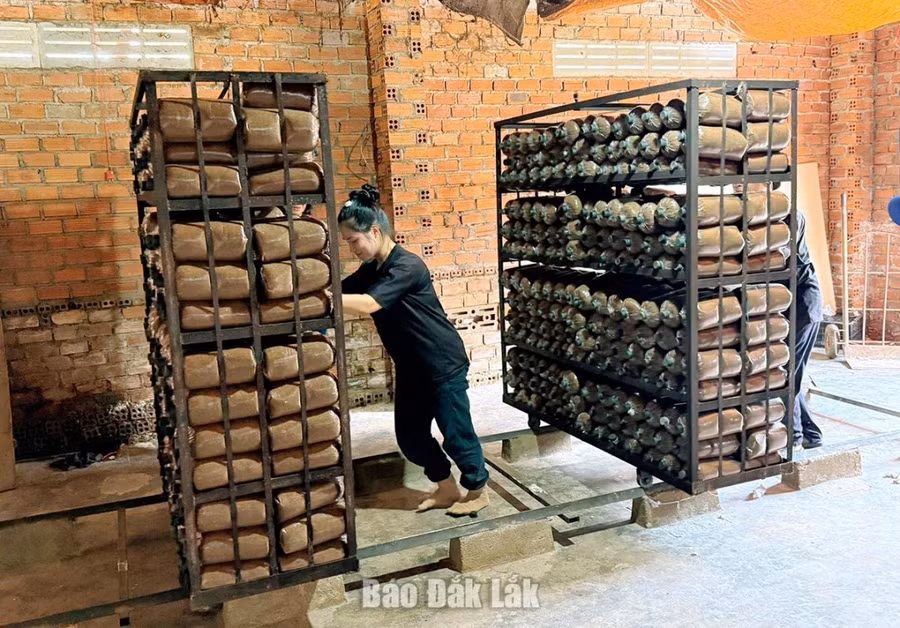 Để trồng nấm, người nông dân mua mùn cưa, trộn đều với cám gạo, bột vôi trắng đã qua khử trùng theo tỷ lệ thích hợp rồi đóng bịch...