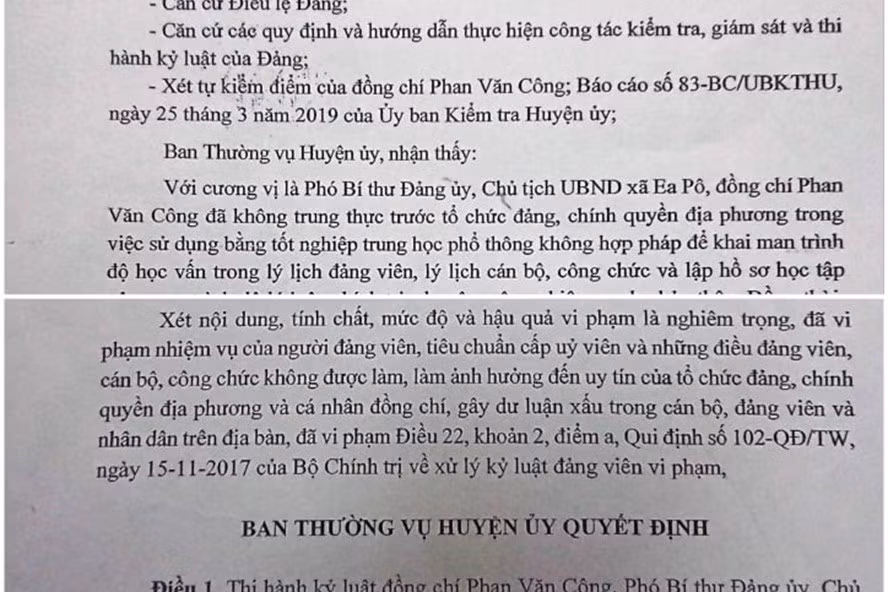 Theo hồ sơ, ông Phan Văn Công khi còn giữa chức Phó bí thư Đảng ủy, Chủ tịch UBND xã Ea Pô không trung thực trước tổ chức đảng, chính quyền địa phương trong việc sử dụng bằng tốt nghiệp THPT không hợp pháp.