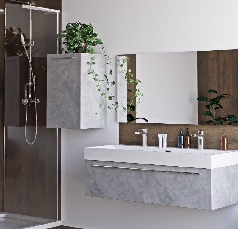 | Gạch lát thủy sinh nhạt và sàn đá trắng và xám nhạt tạo nên sự cân bằng phù hợp. Các điểm nhấn bằng gỗ tối màu tạo thêm nét tương phản. |