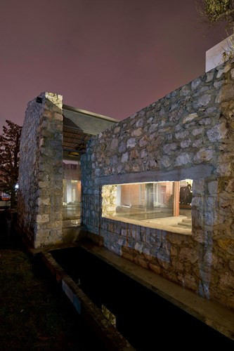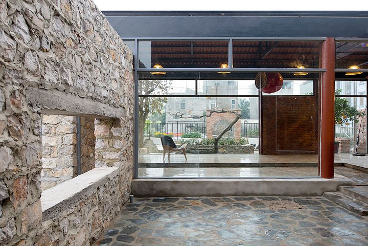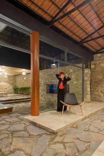 Tường đá dày kết hợp với cửa kính tạo sự tương phản, độc đáo.