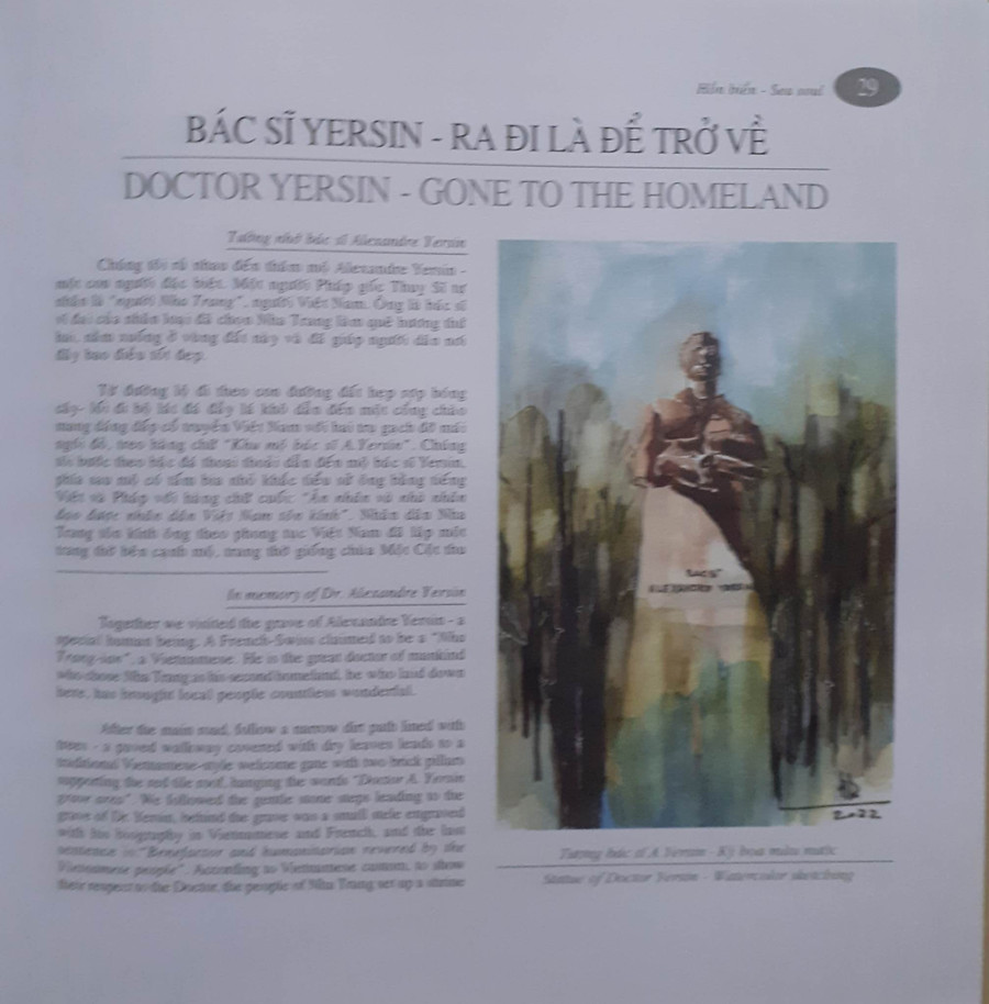 Nhưng đất đai, địa hình địa vật, sóng biển muôn đời vẫn còn đó. Chỉ có khác đi là mỗi thời mỗi cách tạo dựng và tìm cách tồn tại của con người nơi vùng đất ấy. Với Nha Trang, kiến trúc sư Nguyễn Ngọc Dũng trang trọng đặt một nhân vật vào chương đầu, đó là BÁC SĨ YERSIN (mà tôi muốn viết hoa, cũng giống như sự trang trọng thành kính của Dũng), một vĩ nhân y học đồng thời là một nhà thám hiểm lừng danh. Anh đặt tựa của chương này với một câu ngắn gọn, nhưng đầy sức nặng tôn vinh: Bác sĩ Yersin-Ra đi là để trở về. Rồi anh kể lại một hành trình cuộc đời bác sĩ Yersin, trong vỏn vẹn 7 trang sách (cả Việt lẫn Anh), kể cả tranh vẽ bằng ký họa màu nước, nhưng gom chứa trong đó là sự quý trọng không tả hết. Nhìn những bức vẽ ấy, từ khuôn tượng trong khu mộ của Alexandre Yersin cho đến hình dáng cái xóm Cồn, nơi Yersin sống những năm cuối đời với biệt danh thân thương người dân đặt cho là “ông Năm xóm Cồn”, kèm với lời kể của Dũng, bỗng thấy sống động vô cùng. “Chúng tôi im lặng đứng quanh mộ, tưởng tượng ra thước phim mờ ảo cuộc đời cô độc của nhà bác học-bác sĩ Yersin. Thuở ấy, rừng núi hoang vu, thú dữ rình rập, muỗi mòng rắn rết, khí thiêng nước độc, nhà bác học vẫn đam mê đi và khám phá…”.