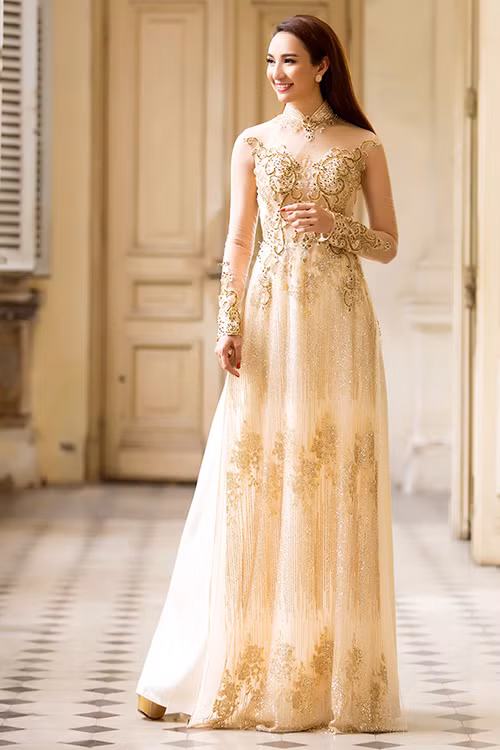 | Mẫu áo màu nude, đính ren vàng kim, kết hợp hạt pha lê thích hợp cho những buổi tiệc sang trọng. |