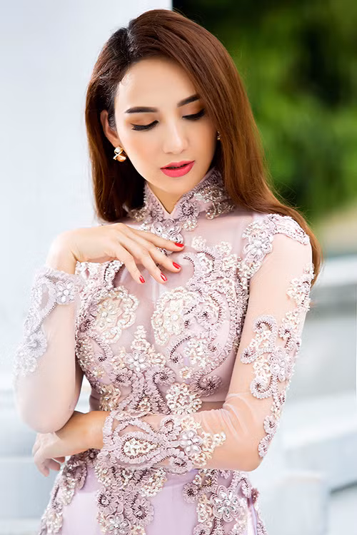 | Hoa hậu quyến rũ hơn khi diện chiếc áo tím pastel chất liệu voan mỏng, xuyên thấu. |