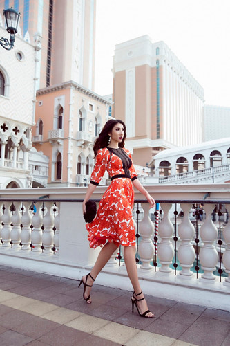 Trong lựa chọn đầu tiên, Ngọc Quyên chọn chiếc váy đỏ xòe bồng bềnh nổi bật giữa đường phố nhờ họa tiết tông đỏ nổi bật. Chất liệu xuyên thấu điểm xuyến trước ngực giúp nữ người mẫu khoe trọn lợi thế về vòng một gợi cảm. Nhờ phần vải lưới tông tối, bộ trang phục vẫn giữ được nét yêu kiều, quyến rũ vừa phải.
