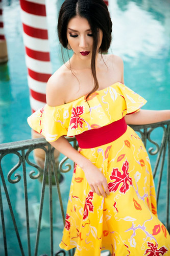 Bộ thứ bảy-Váy hoa. Chi tiết in hoa hiện đại cùng màu sắc rực rỡ của chiếc váy tạo nên một tổng thể sinh động, gây ấn tượng mạnh cho người đối diện.