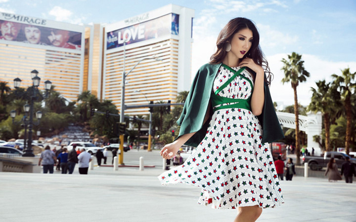 Bộ thứ năm-Váy họa tiết sao. Ngọc Quyên tiếp tục cuộc chơi streetstyle bằng một thiết kế váy xòe in họa tiết. Lần này, cô kết hợp cùng áo khoác blazer cùng tông xanh lá để vẻ ngoài tránh bị nhàm chán.
