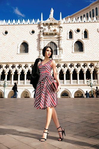 Bộ thứ sáu - Váy họa tiết tứ giác. Không chỉ dừng lại ở những kiểu mỹ đơn giản, kiểu váy họa tiết tứ giác trải dài theo phần thân áo kèm phần ghép nối mạnh mẽ này càng khiến Ngọc Quyên thêm phần đẳng cấp.