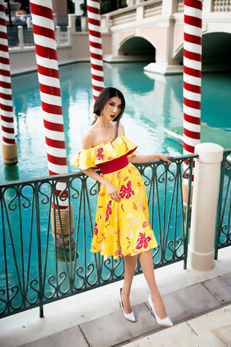 Chiếc váy cúp ngực tông vàng chủ đạo giúp Ngọc Quyên đẹp mỹ miều, rạng rỡ cả góc phố. Phần thân áo xếp ly tuy giản dị, nhẹ nhàng nhưng vẫn phô diễn được bờ vai nõn nà của người đẹp.
