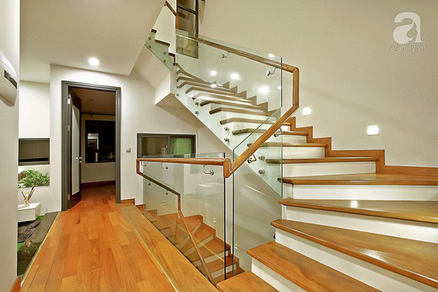 Cầu thang vách kinh nhẹ nhàng, hiện đại.