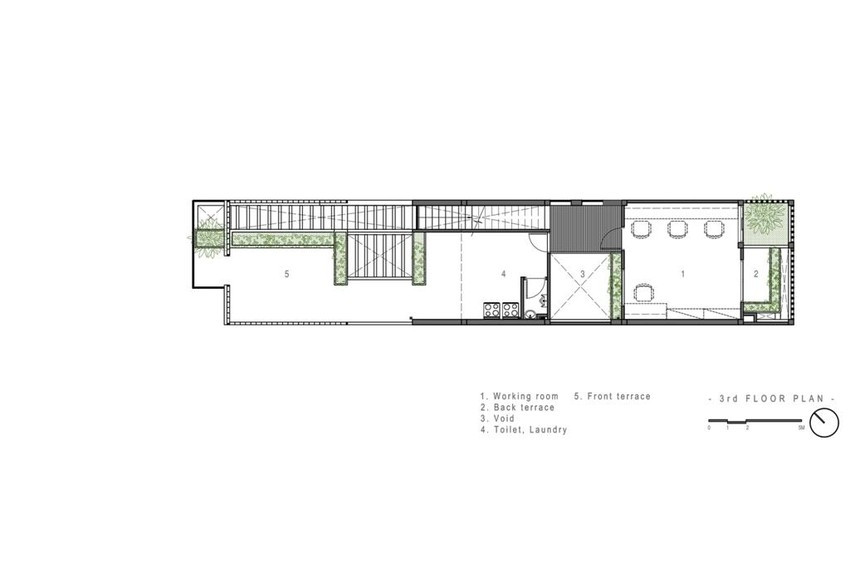 | Các phòng chức năng trong nhà đều được tiếp xúc thông thoáng tự nhiên thông qua các khoảng thông tầng giữa và sau nhà. |