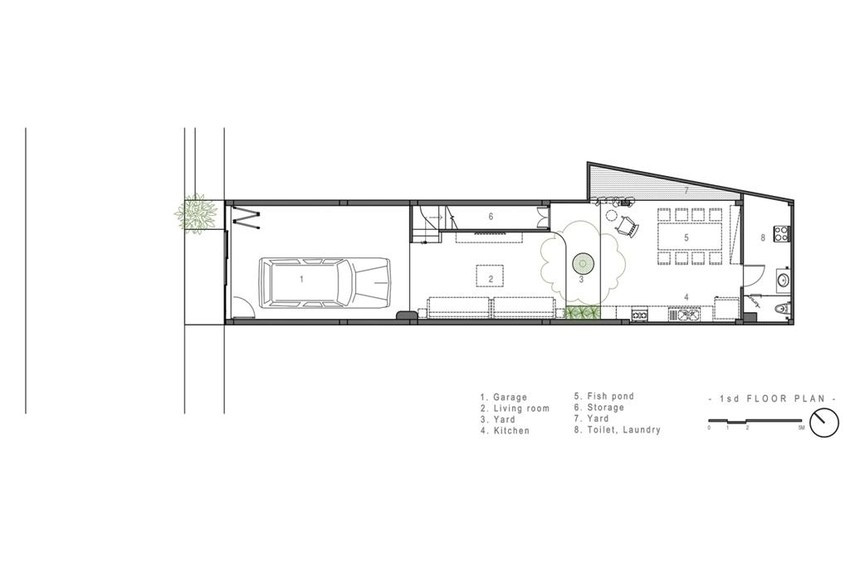 | Kết nối giữa phòng khách và bếp là khoảng sân vườn nhỏ giữa nhà. |