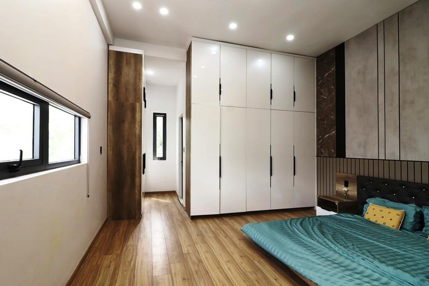 | Phòng ngủ được lát sàn gỗ, hệ tủ áp tường đơn giản. |