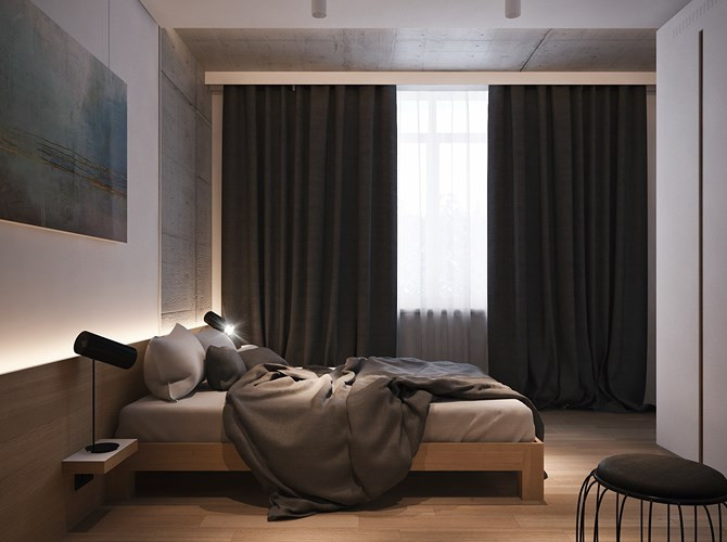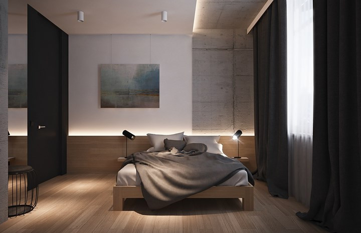 Rèm cửa hai lớp giúp điều chỉnh ánh sáng trong phòng, giường ngủ bằng gỗ mang lại cảm giác ấm áp, gần gũi với thiên nhiên.
