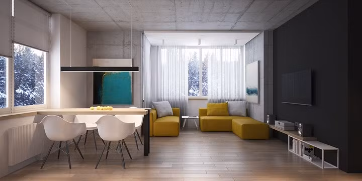 Bộ ghế sofa màu vàng khiến ngôi nhà không bị rơi vào cảm giác nhàm chán.
