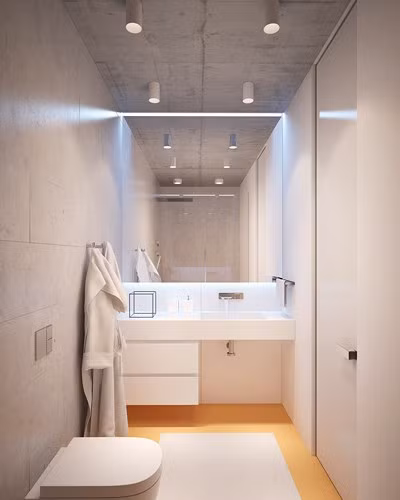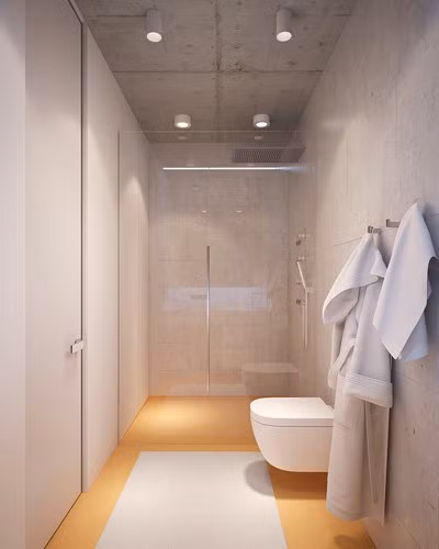 Nội thất đơn giản cùng chiếc cửa kính giúp không gian phòng tắm trông rộng và thoáng hơn.