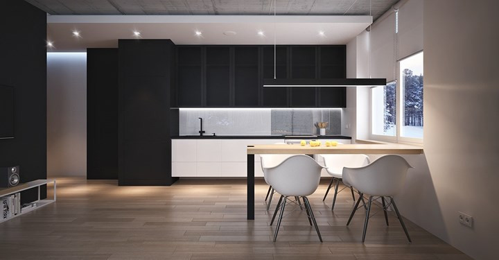 Phòng ăn và bếp nấu chỉ sử dụng hai màu đen, trắng mang đến cảm giác sang trọng, huyền bí.