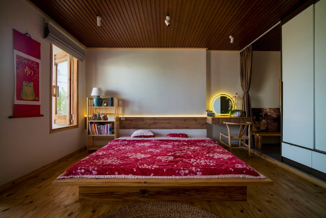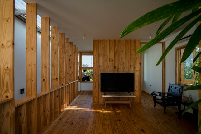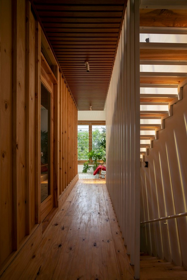 Gỗ được lựa chọn là vật liệu chính cho cầu thang, tầng hai và ba tạo cảm giác mộc mạc và thân thiện.