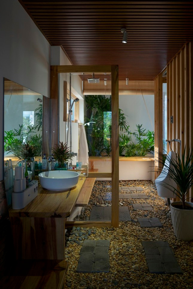 | Ngôi nhà gây ấn tượng với phần sân vườn xanh mát bố trí khéo léo khắp nhà, đan xen với khối kiến trúc tạo ra một không gian hài hòa, ưu sinh. |
