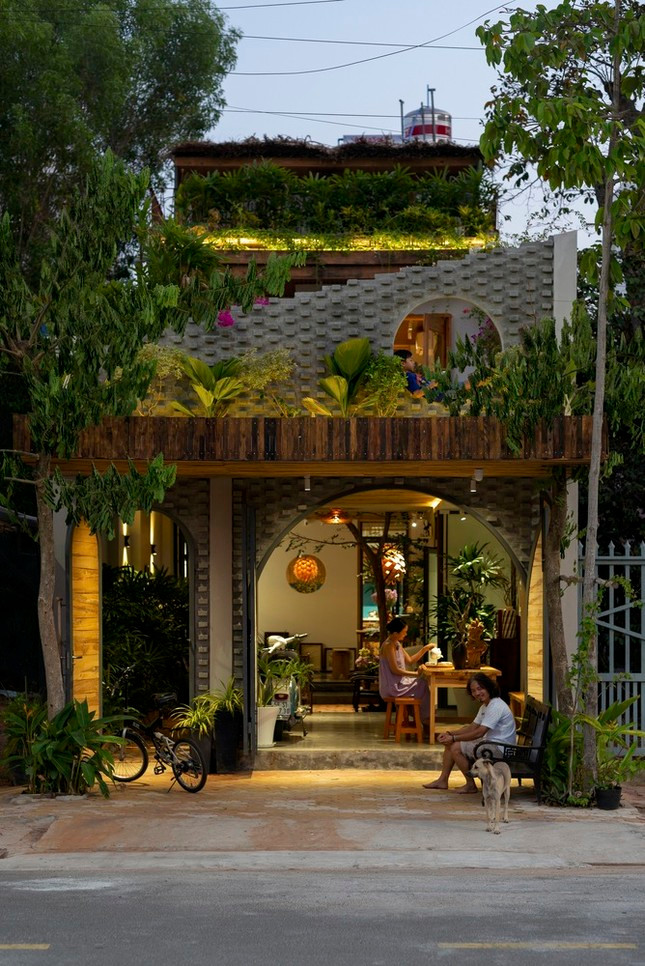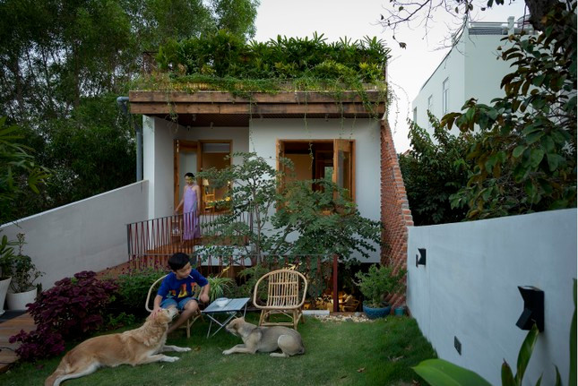 Ngôi nhà có thiết kế đặc biệt như chiếc tổ dế mèn, việc thu gọn khối nhà ở tầng hai để bố trí sân vườn phía trên tầng một giúp toàn bộ khu vực sinh hoạt chung giống như đang ở dưới lòng đất.