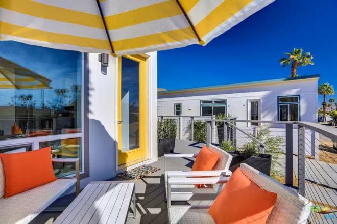 Giữa bầu trời trong xanh, nắng vàng nhẹ cùng phong cảnh đồi núi yên bình xung quanh, màu vàng của điểm nhấn từ viền cửa và trên ô che trước hiên nhà đủ để giúp không gian ngoại thất thêm ấn tượng.