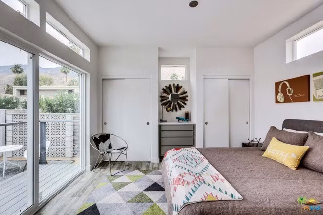 Phòng ngủ bên cạnh được trang trí tương tự. Khác một chút đó là không gian nghỉ ngơi được chọn điểm nhấn với gam màu trung tính, thâm trầm nhẹ nhàng đủ để khiến mọi người cảm thấy vui vẻ, bình yên và tĩnh tại khi nghỉ ngơi tại đây. Những họa tiết hình học không mấy cầu kỳ, màu sắc không mấy nổi bật nhưng chính sự dịu nhẹ ấy lại mang đến nét thanh lịch và tinh tế cho căn phòng.