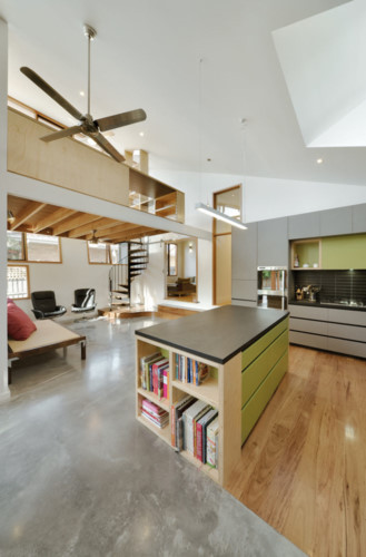 Sàn bê tông được đánh bóng kết hợp với sàn gỗ trong nhà bếp để tạo hiệu ứng thị giác.