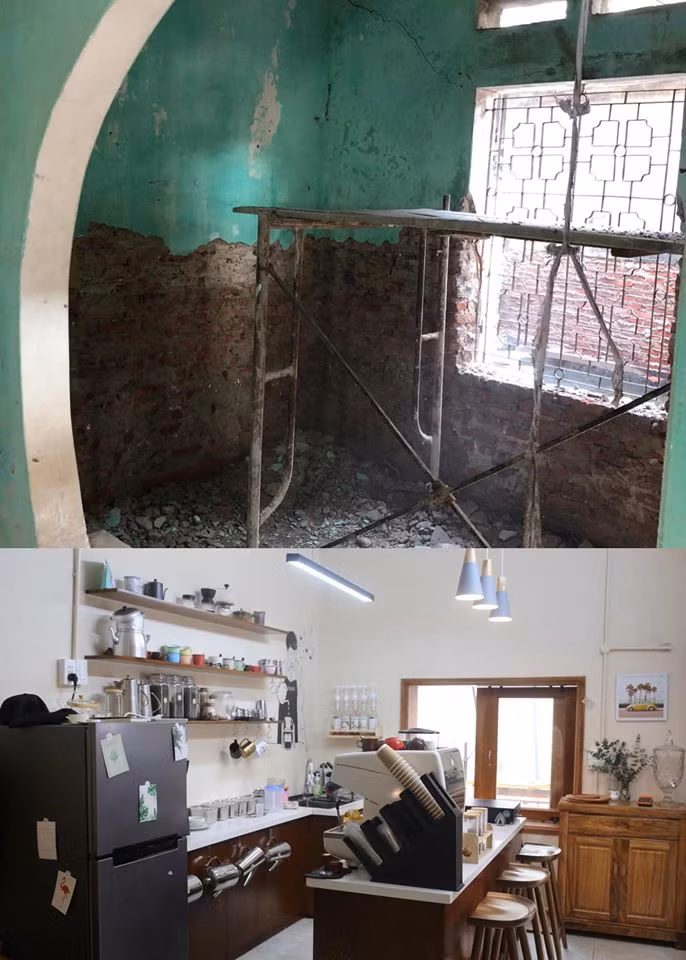 | Thuận Nguyễn chỉ giữ lại cốt nhà và sửa lai toàn bộ. "Cái gì hỏng thì làm lại như bề mặt tường ngày trước làm bằng vôi vữa nên mình nhờ đục bỏ toàn bộ và chát lại. Do chúng mình tự lên ý tưởng và phương án nên nghĩ đến đâu làm đến đó, nước đến chân bắt đầu nhảy, nhưng may mắn mọi thứ đều suôn sẻ, từ thợ xây, thợ cửa, thợ điện, thợ nước ... mọi thứ cứ đều đều diễn ra tốt đẹp", Thuận Nguyễn kể. |