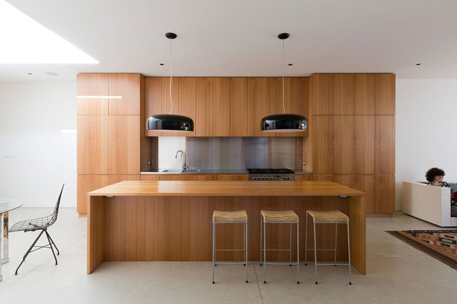 Tuân thủ theo phong cách thiết kế đó, phòng bếp tiếp tục là sự xuất hiện của gỗ và sàn gạch bóng. Tối giản đến vô cùng nhưng bao đẹp và chất các bạn nhé.