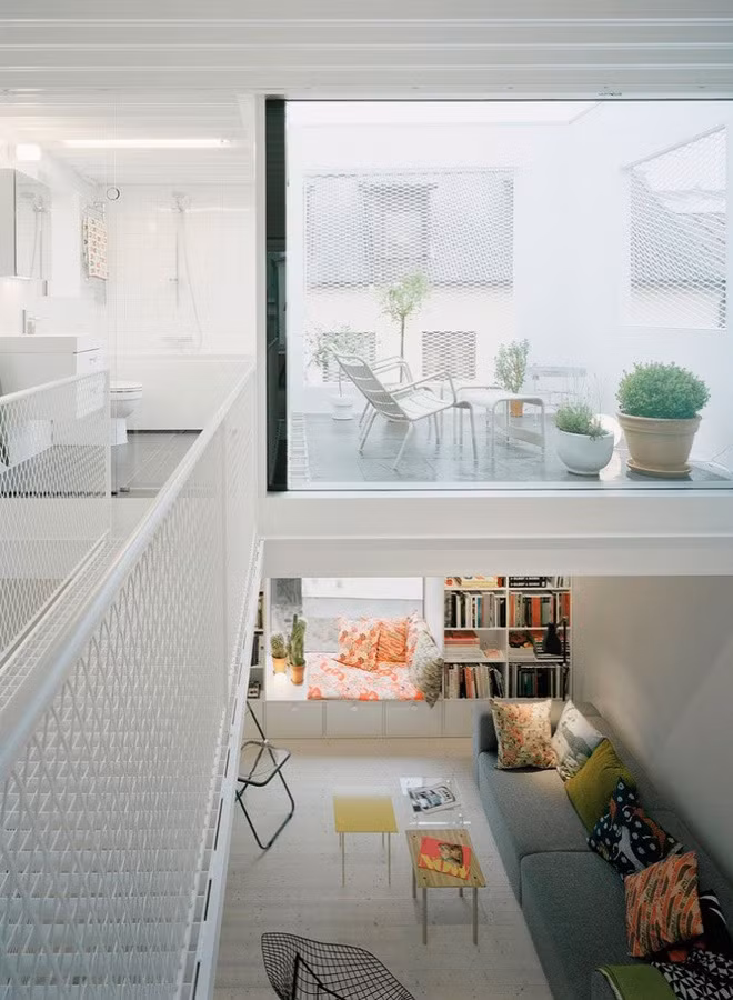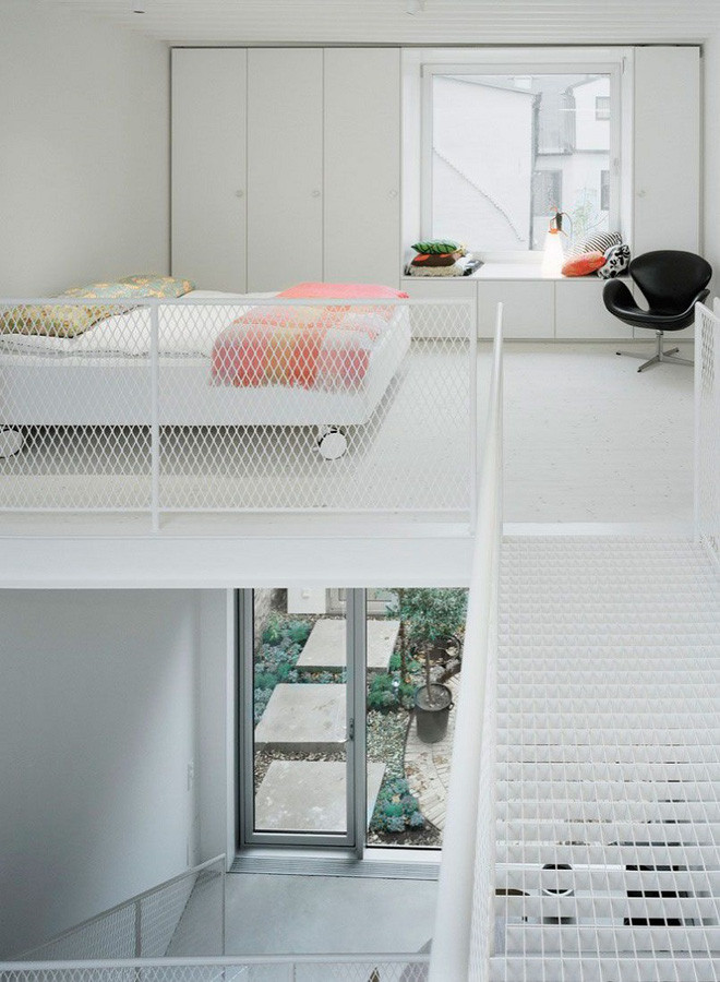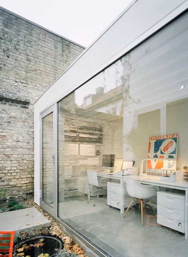 Một phòng làm việc nhỏ, cũng với tông màu trắng, có không gian mở ra bên ngoài sân vườn, nhờ tấm kính thủy tinh trong suốt. Với cách làm này, chủ nhân ngôi nhà cũng ăn gian thêm được chút ít diện tích trong mắt người nhìn rồi.