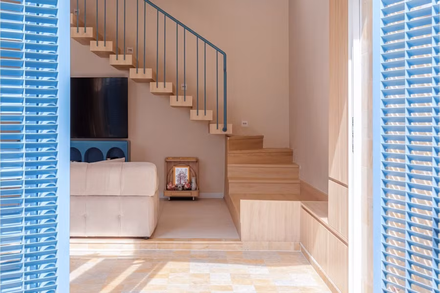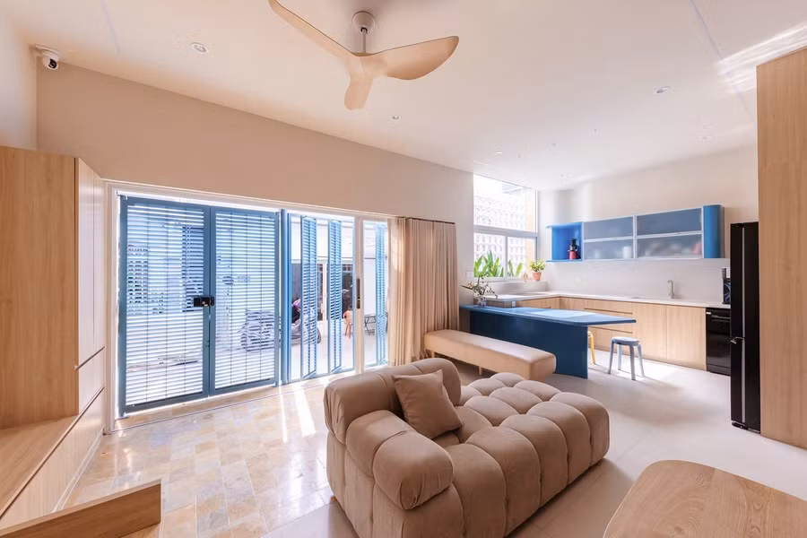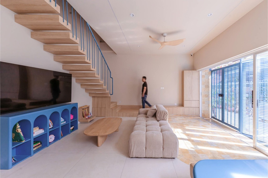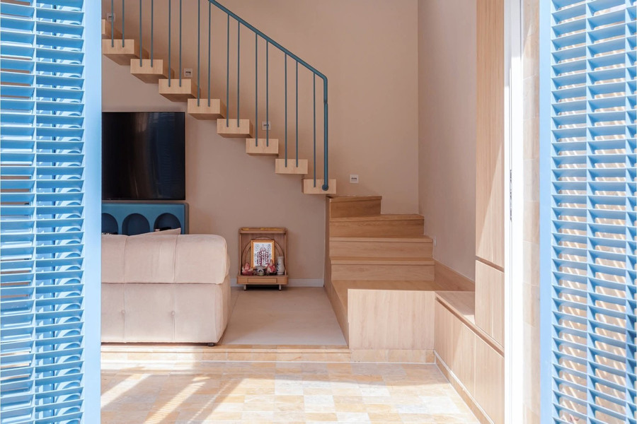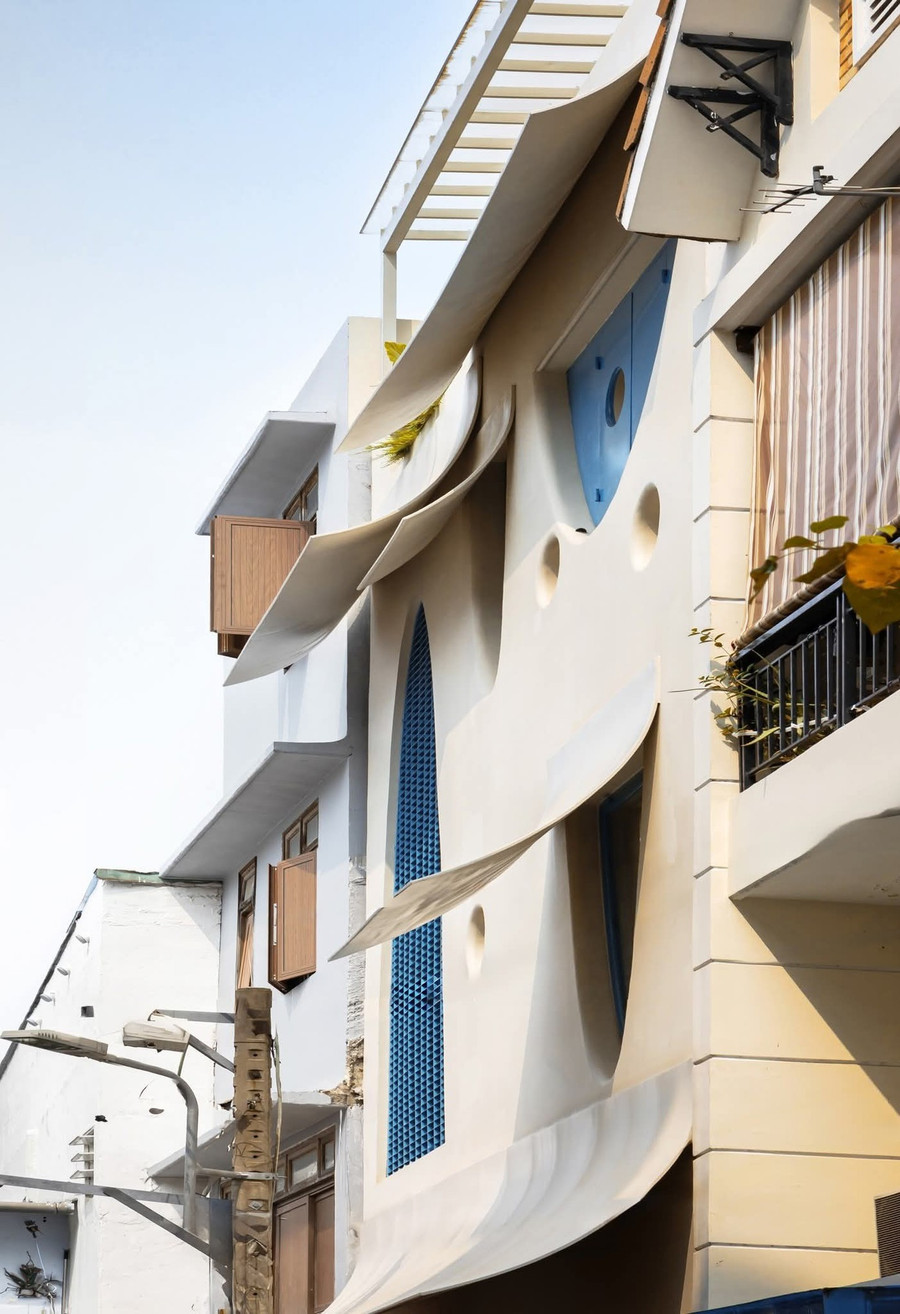 Ngôn ngữ “xếp - gấp - mở” được thể hiện ngay từ mặt tiền với các lớp hình khối chồng xếp, vừa che nắng hướng Tây, vừa đón gió và giữ sự riêng tư cần thiết cho không gian sống. Những chuyển động ấy khiến ngôi nhà như đang “thở”, thích nghi mềm mại với khí hậu và nhịp sống đô thị.