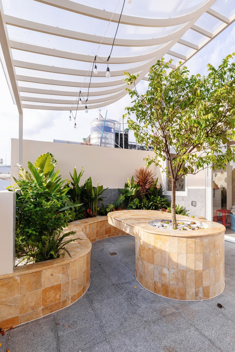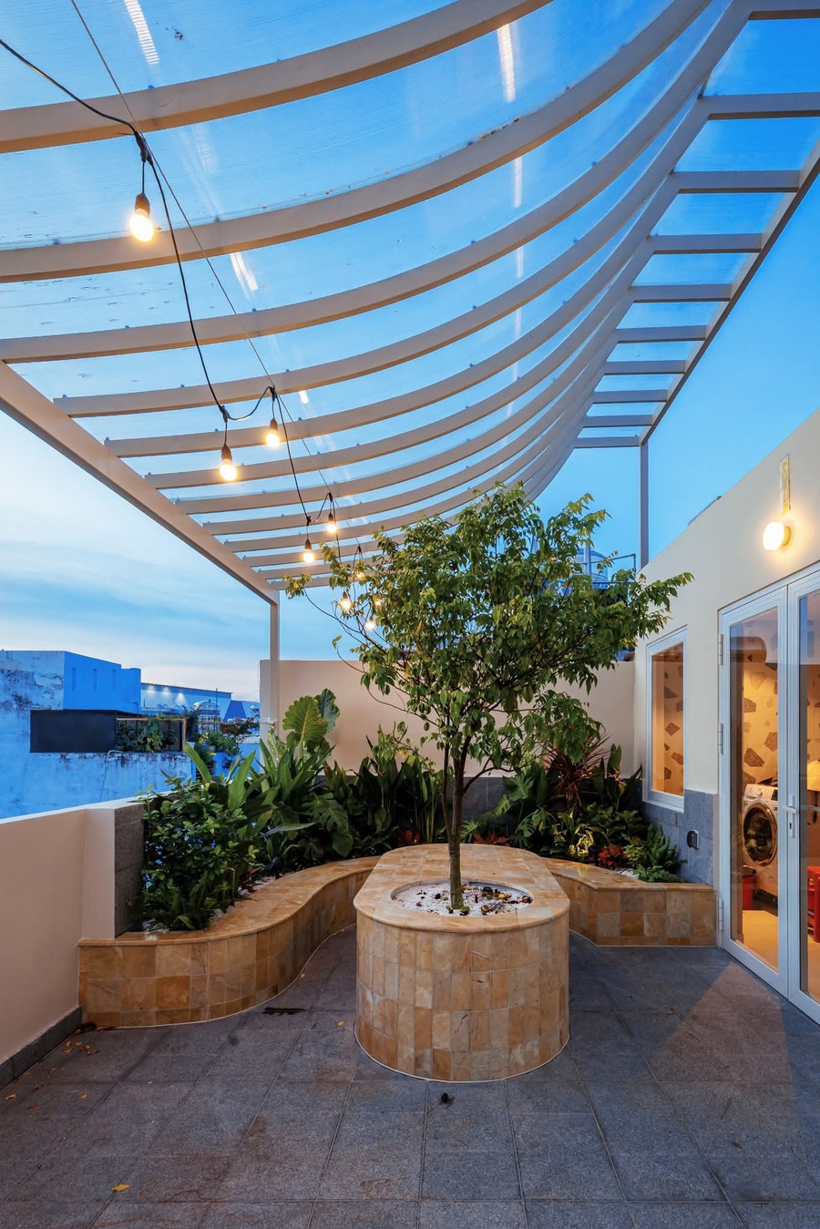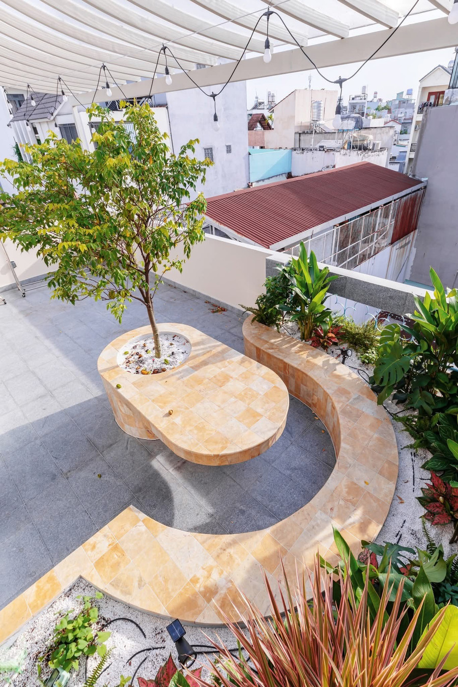 Sân thượng là không gian xanh cho gia đình, các đường cong linh hoạt vẫn được tiếp tục một cách thống nhất.