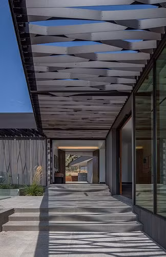 Phần mái hiên không phải là một khối mà là một kết cấu dạng lưới, có thể cho ánh nắng đi qua, giảm nhiệt vào mùa nóng và hấp thụ nhiệt vào mùa đông.