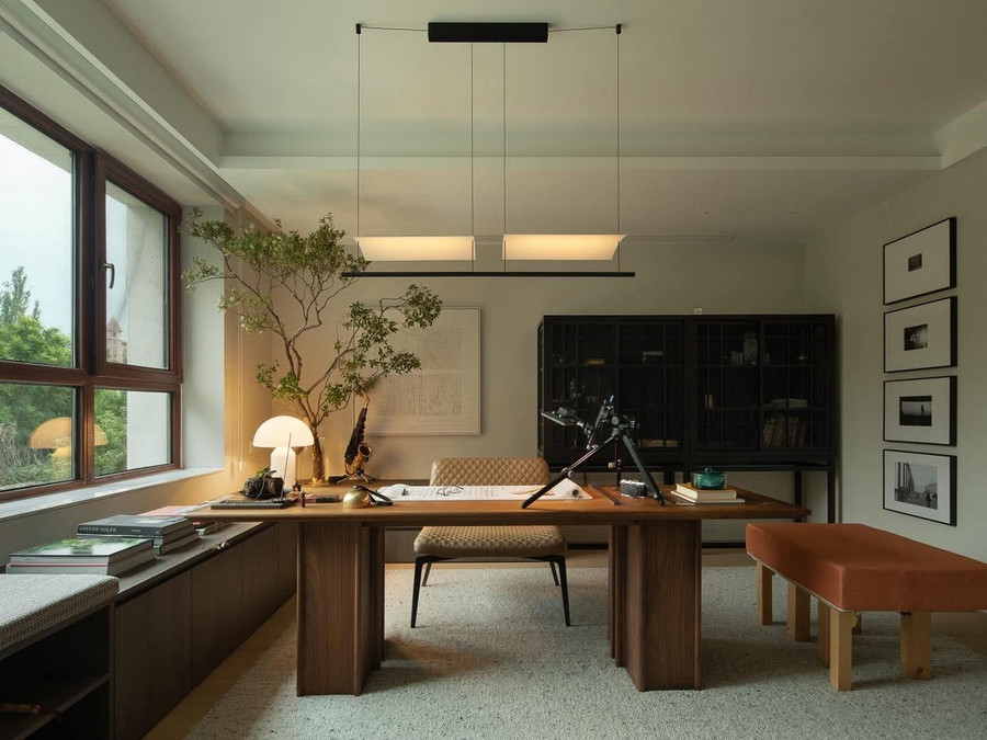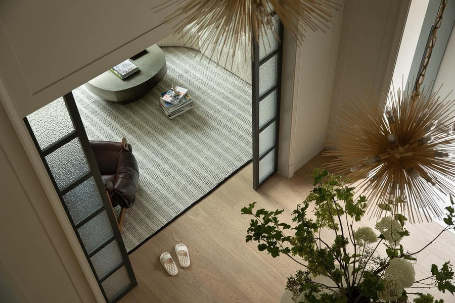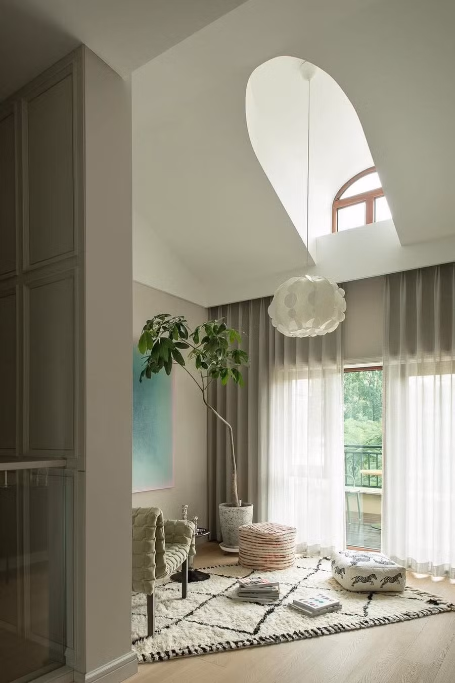 Lên tầng trên, không gian riêng tư mở ra. Tầng áp mái là ẩn thất của gia chủ nơi mái dốc giữ nguyên cấu trúc ban đầu và cửa sổ mái cắt ánh sáng thành những hình khối thay đổi theo ngày. Căn phòng ngủ mang tông trắng ngọc trai, kem vani và xám nhạt, tạo nên sự yên bình tuyệt đối.