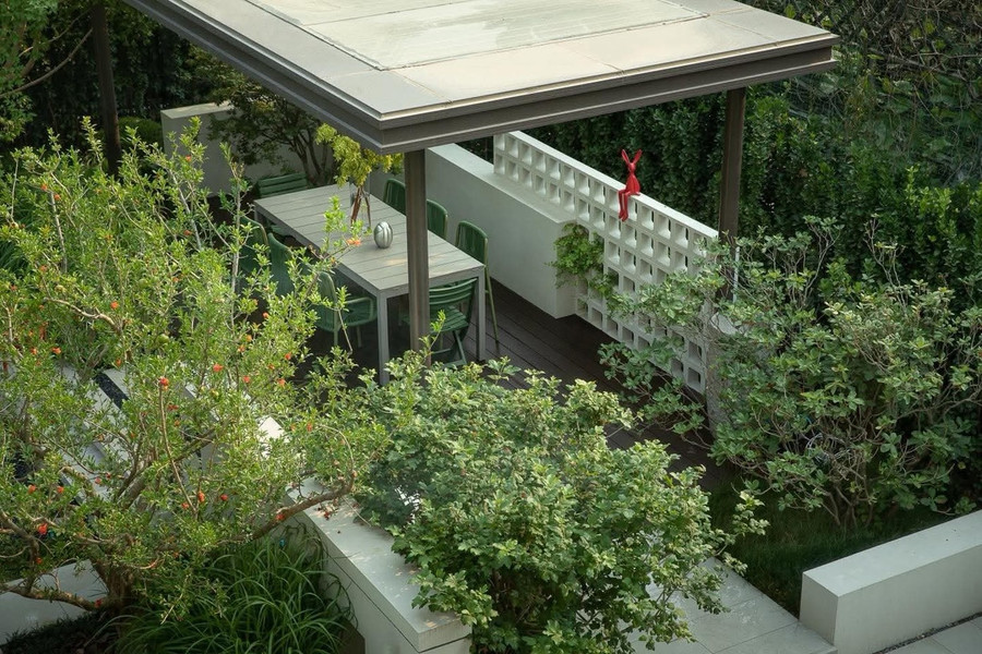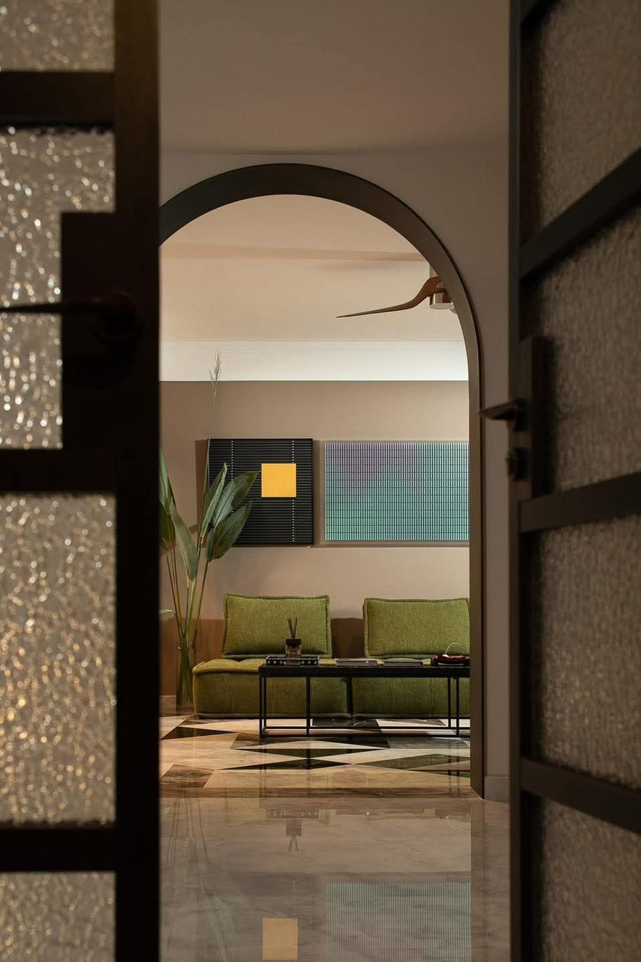 Hai khu bếp Á và Âu đáp ứng nhịp sống linh hoạt của gia đình. Dưới tầng hầm, KTS tạo “khu vườn bí mật” từ giếng trời nhỏ đậm chất thư giãn với ghế sofa nhung olive, sàn khảm đá cẩm thạch hình học, và ghế da đồng thau dưới bức tranh rực rỡ màu sắc.