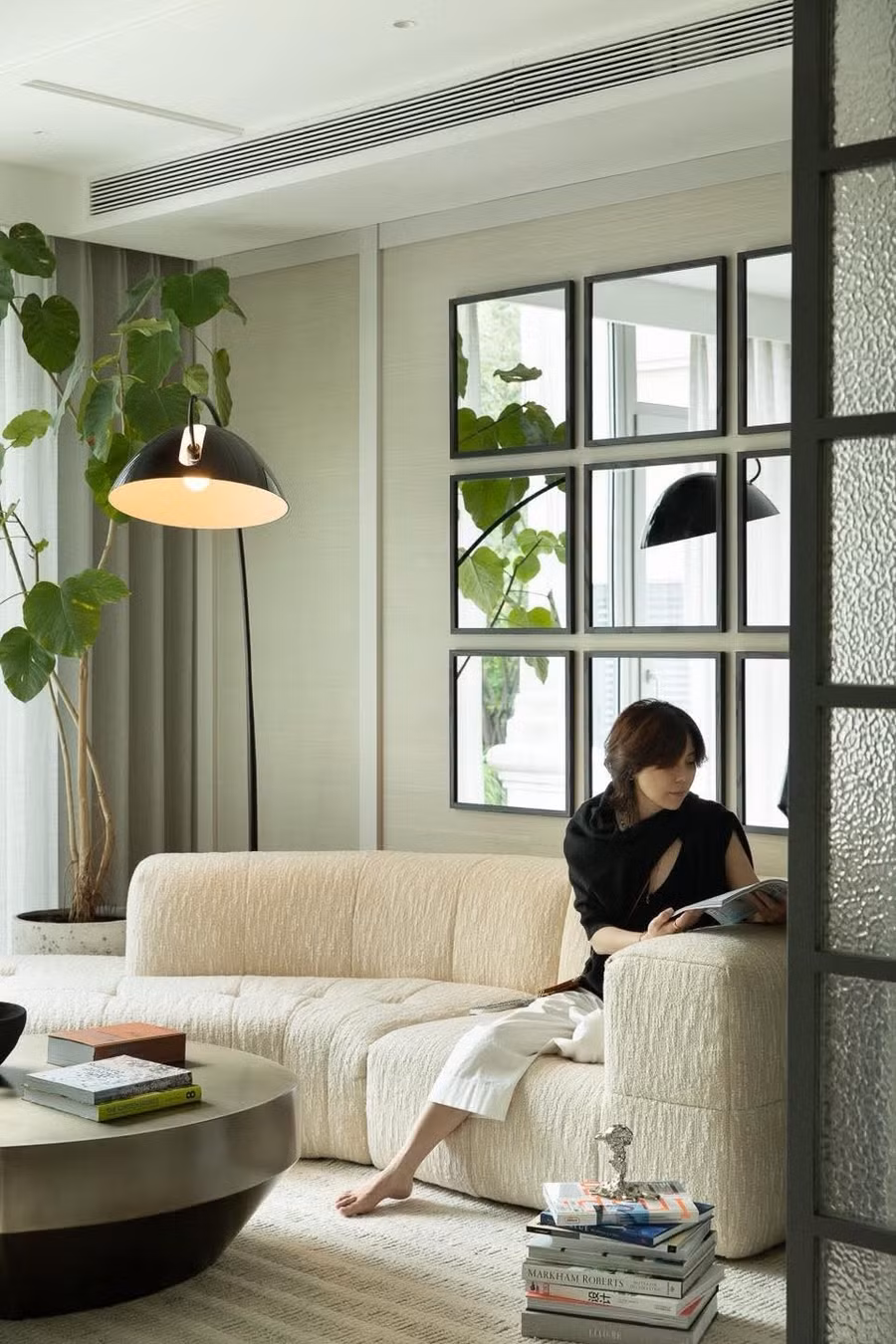Phòng khách không có tivi, không đèn chính mà cố tình rộng ra khu vườn, nơi gương phản chiếu những bụi cẩm tú cầu, khiến khung cảnh như không có bức tường ngăn cách.