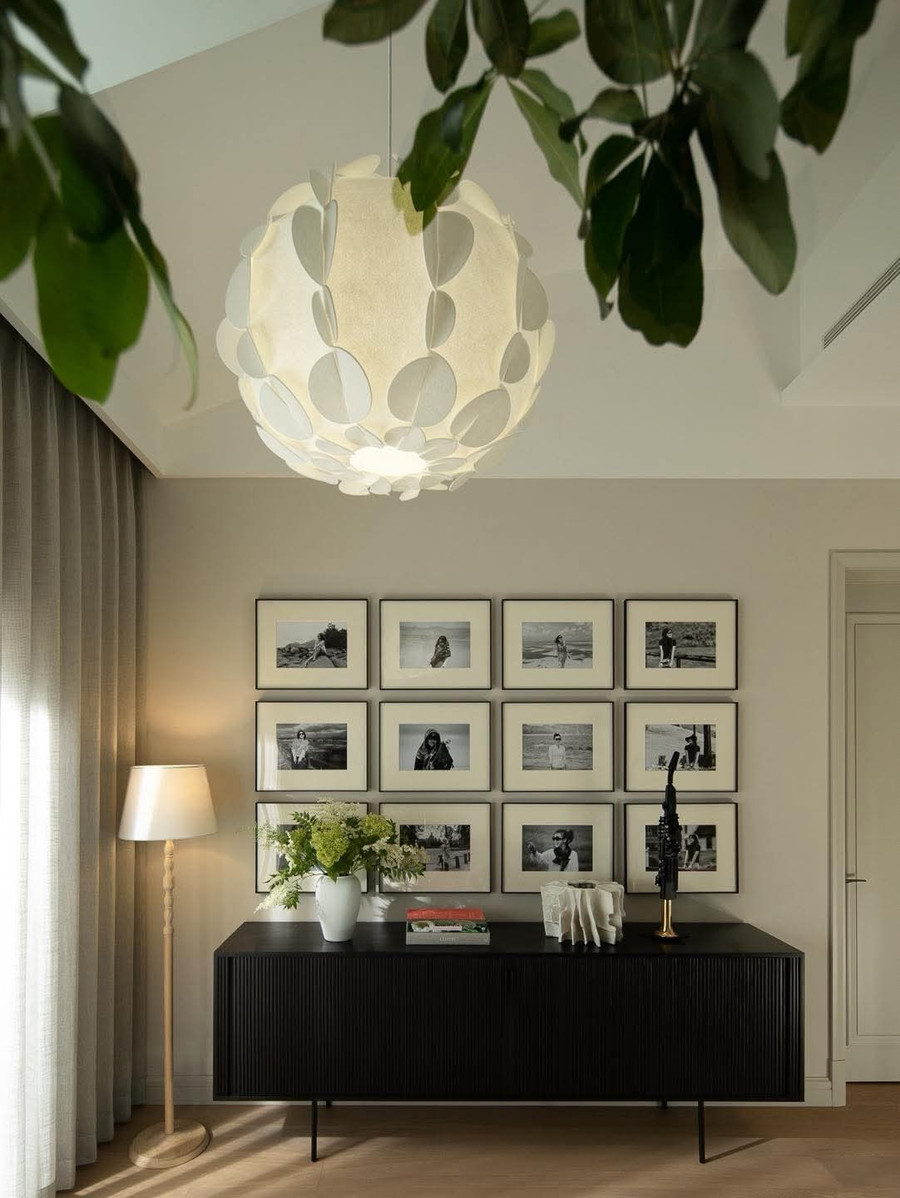 Toàn bộ không gian sống được thiết kế tiết chế, ấm áp và có chiều sâu. Khoảng sân trung tâm phủ sỏi đen với bếp lò gang tạo tâm điểm cho những buổi tối tĩnh lặng.