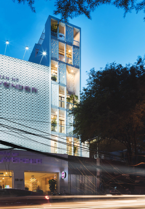 Khu đất 88 m2 nằm ở trung tâm TP HCM là kiểu lô đất dạng ống với mặt tiền hẹp, chiều dài sâu hun hút. Nhà mặt phố nên gia chủ dành các tầng dưới để làm văn phòng và sống ở các tầng trên.