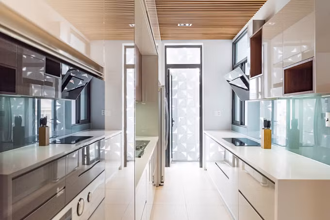 Trần ở phòng khách, bếp, phòng ăn sử dụng lam gỗ liên thông nhau để đem lại cảm giác ấm áp.