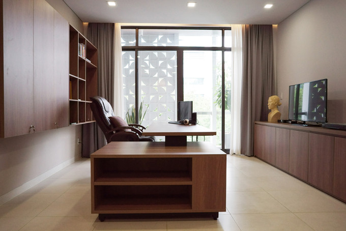 Ba tầng dưới được sử dụng làm văn phòng, ba tầng trên là không gian ở dành cho 4 người: 2 vợ chồng và 2 người con. Tầng trên cùng là khu vực thờ cúng và sân thượng.