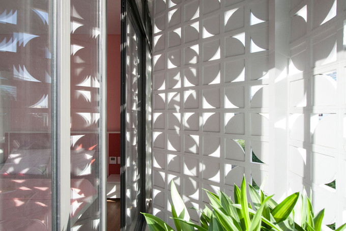 Những mảng chong chóng gió này rất thích hợp với khí hậu nhiệt đới của Sài Gòn, giúp điều tiết ánh sáng, tránh nắng gay gắt chiếu trực tiếp vào nhà. Gạch bông được thiết kế riêng và sản xuất ngay tại chỗ.