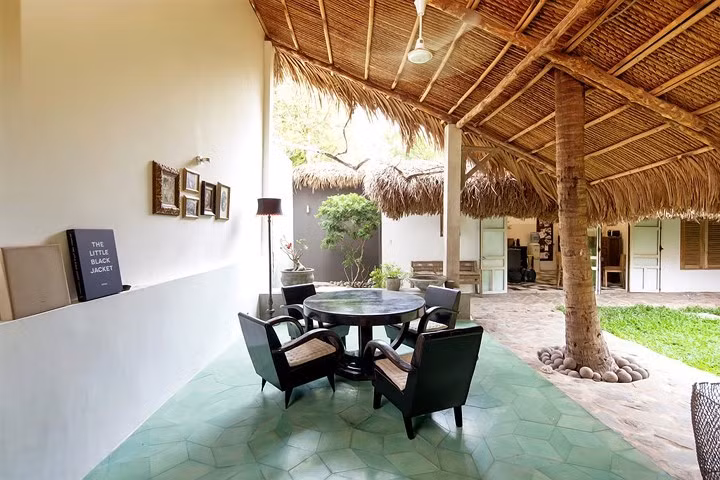 Một bộ bàn ghế ăn đặt ngay ở phần hiên nhà, chất liệu lá tranh dùng để lợp mái vừa có độ bền, có thể che mưa che nắng mà lại còn tạo cảm giác mát mẻ cho người sử dụng.