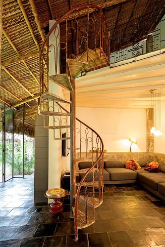 Cầu thang sắt nhuốm màu thời gian là cầu nối giữa tầng trệt với khu vực riêng tư trong nhà.