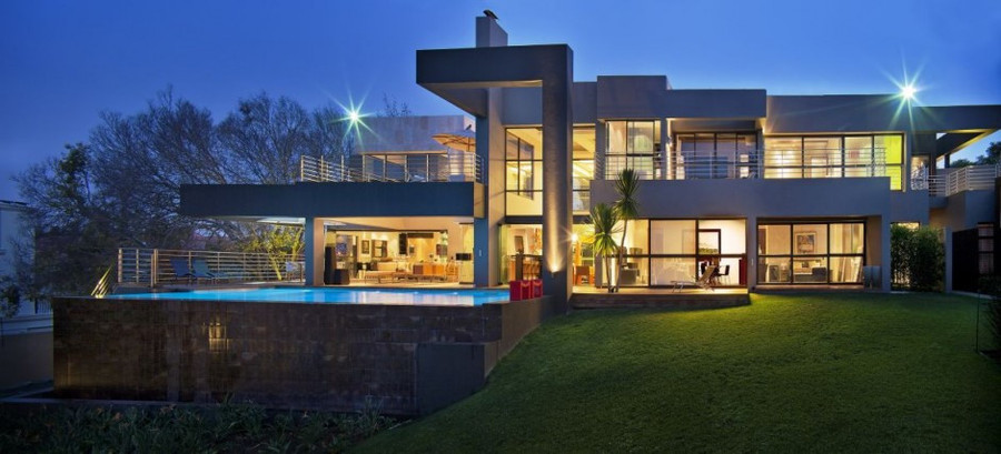 Ngôi nhà tường kính lung linh khi hoàng hôn xuống.
