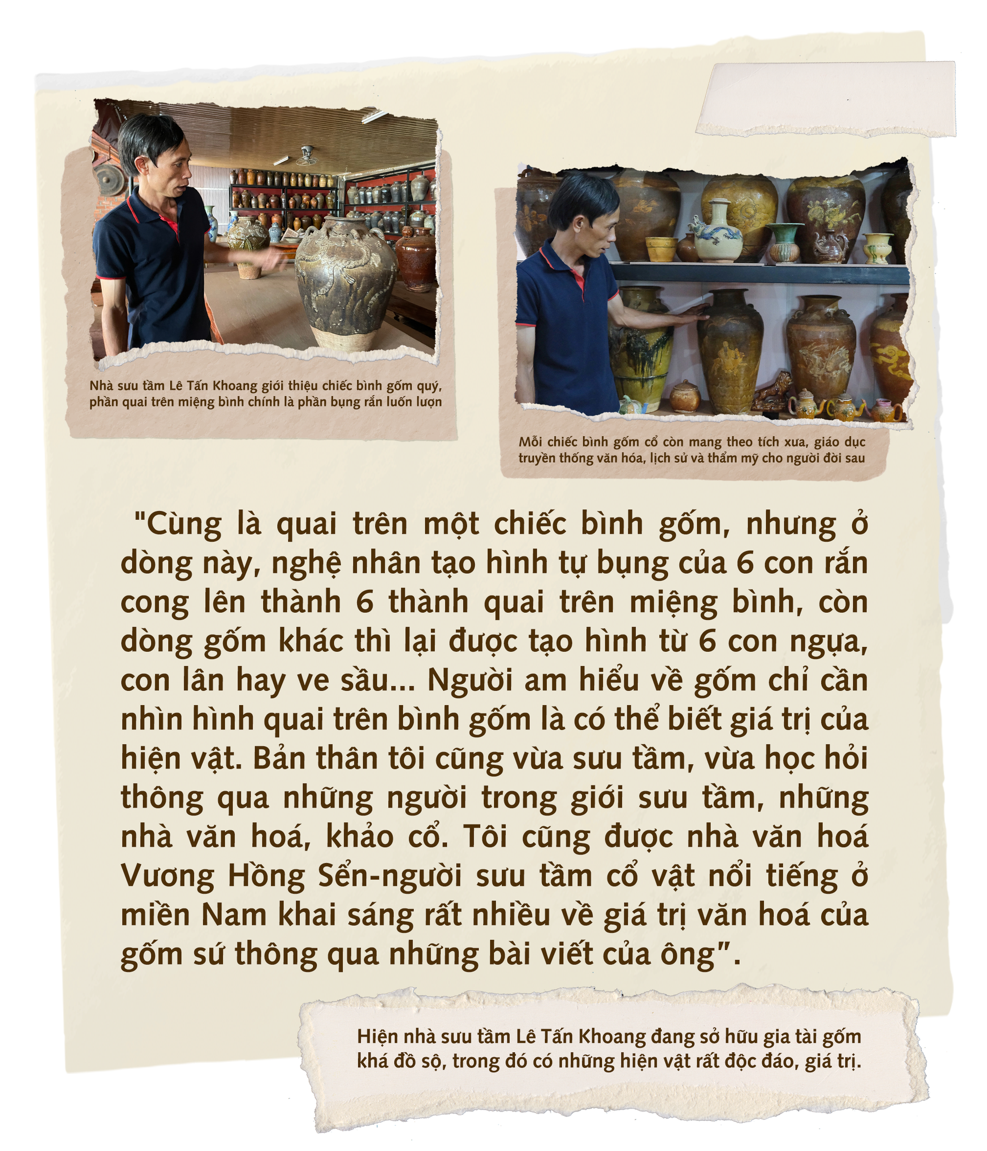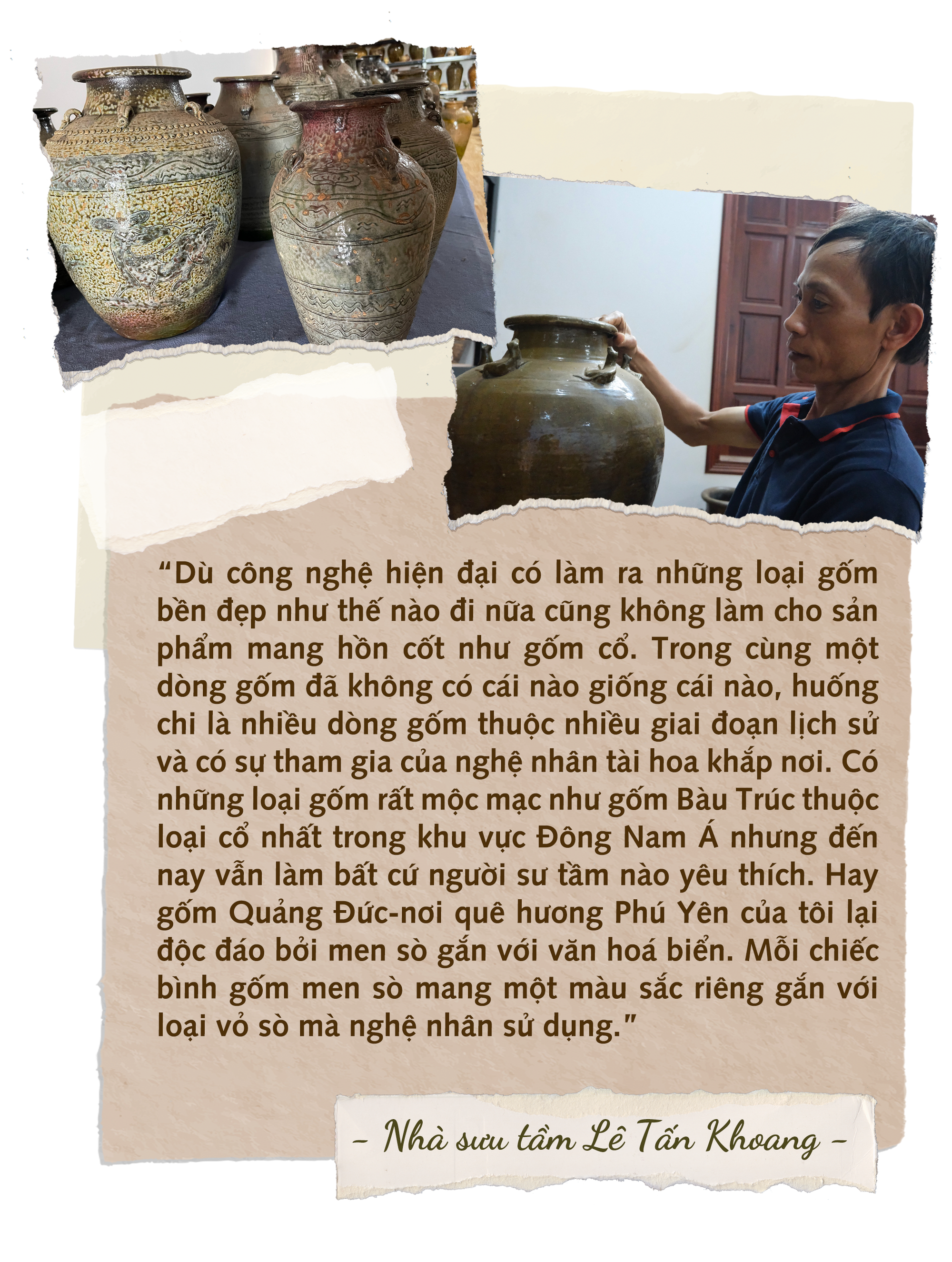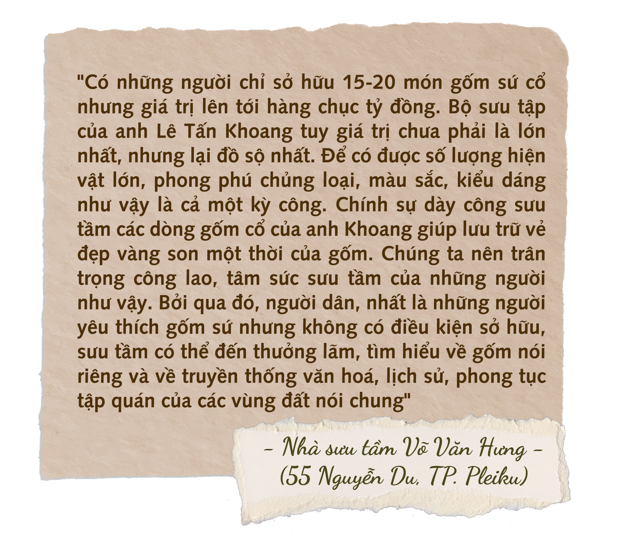 Nhà sưu tầm Lê Tấn Khoang cho biết, mỗi dòng gốm có vẻ đẹp, sắc thái riêng, thể hiện tính địa phương rất rõ. Được làm thủ công bởi những nghệ nhân tài hoa nên anh luôn cảm nhận được sự nồng ấm của gốm. Đó không phải là cái ấm do sức nóng của nước và lửa để tạo ra gốm, mà là sự ấm áp của đôi tay và tâm hồn của nghệ nhân. Đó cũng là điều khiến anh càng sưu tầm thì càng trân quý công lao của các nghệ nhân.