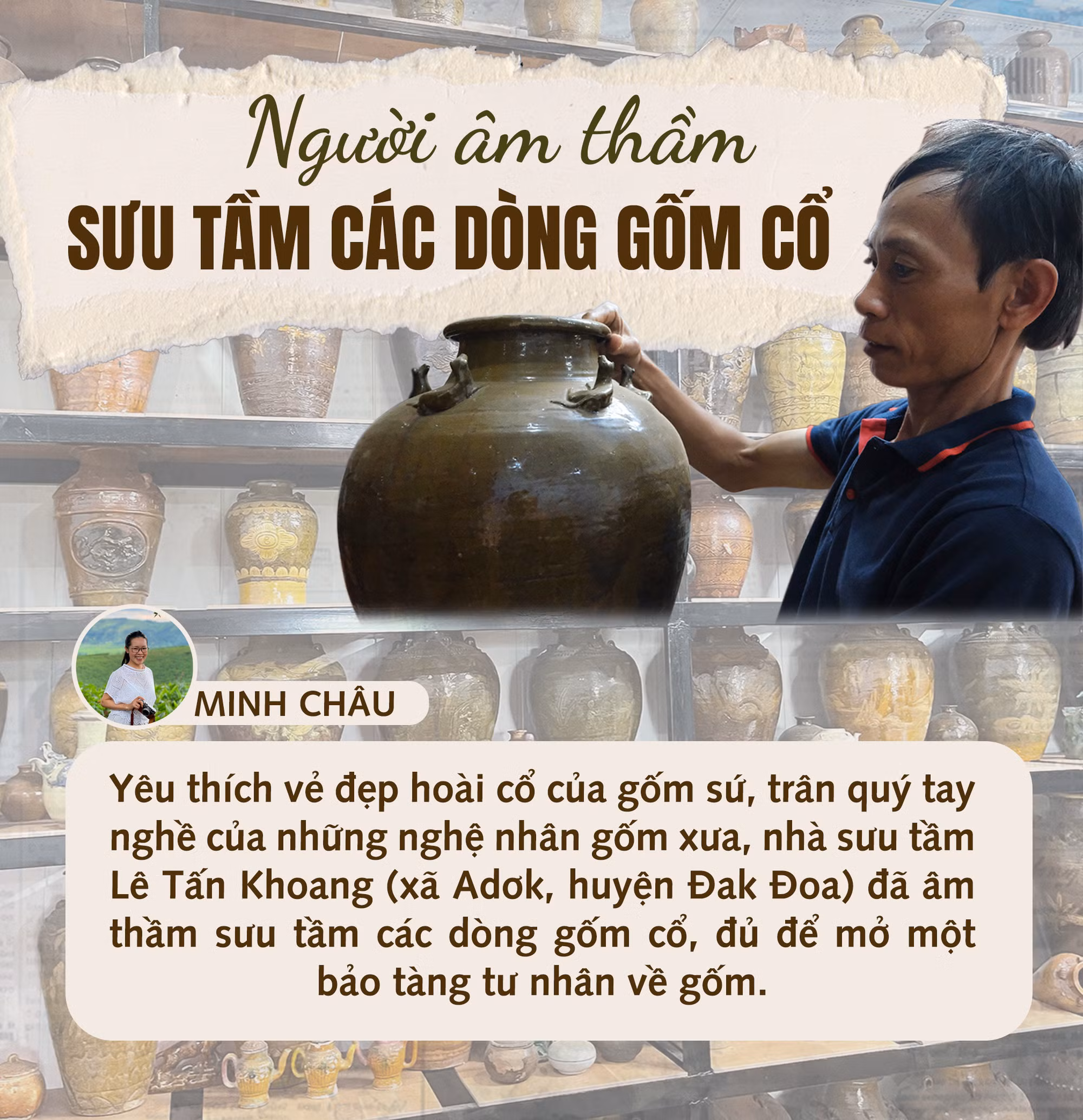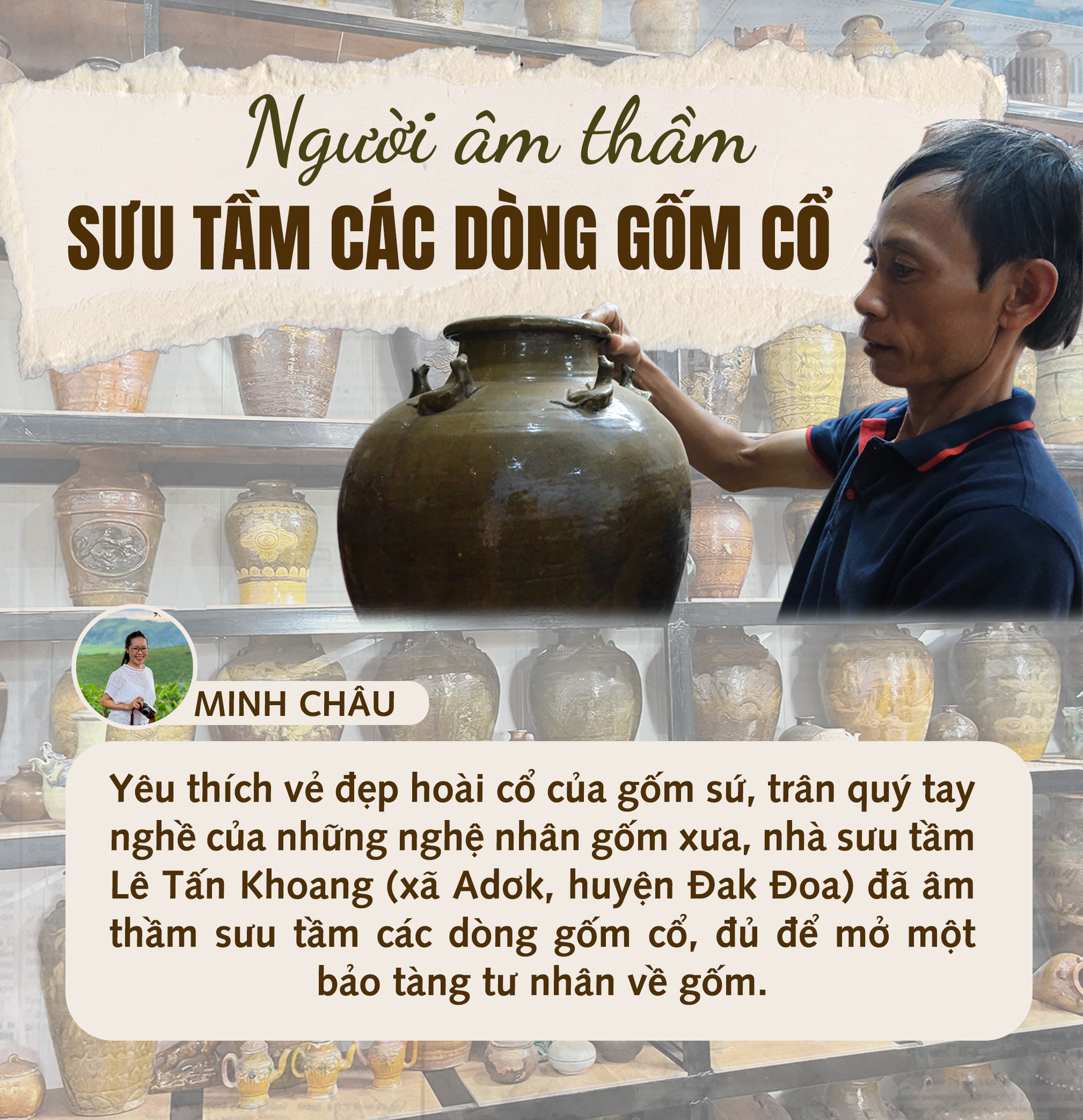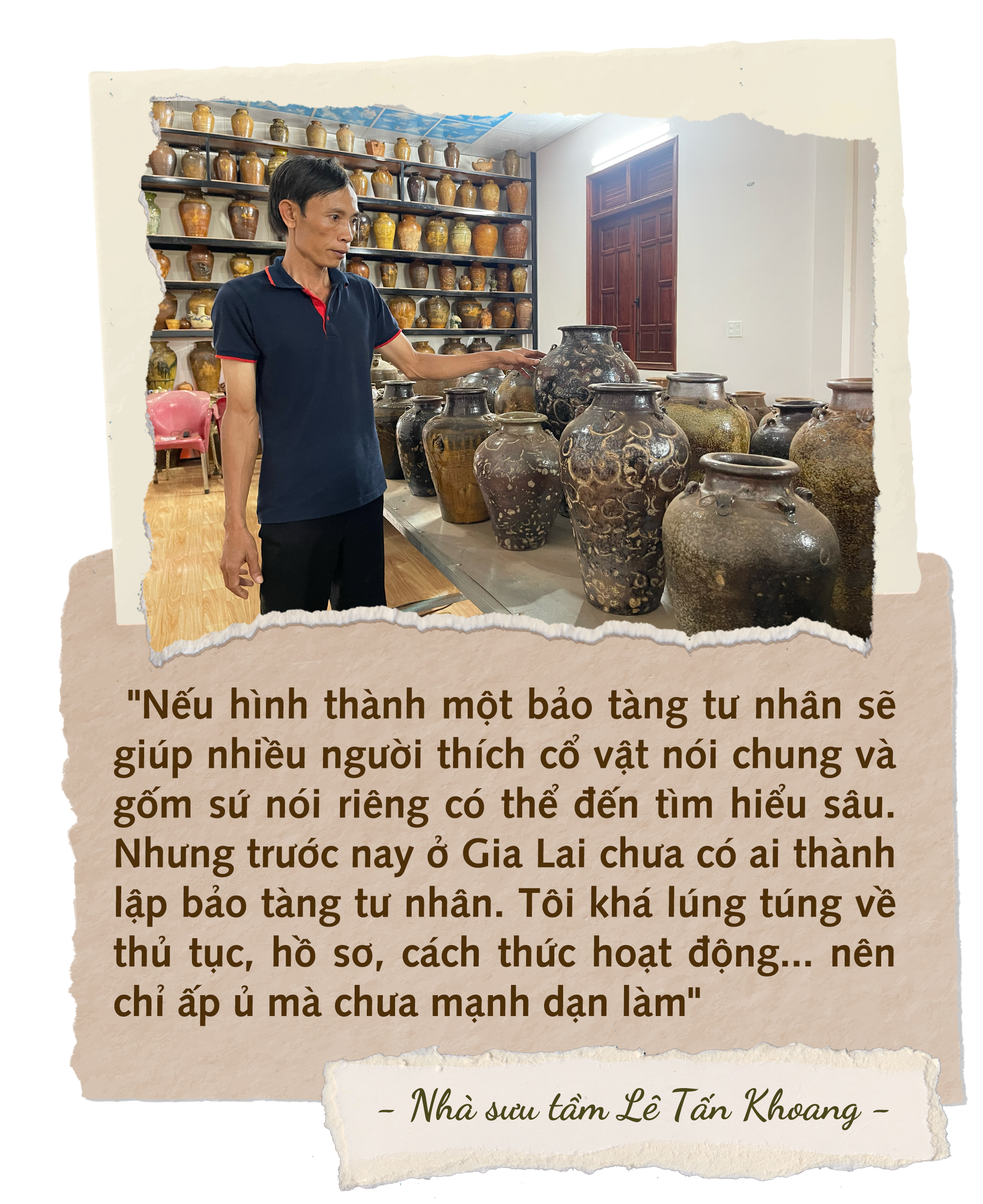 Nhà sưu tầm Lê Tấn Khoang cho biết, mỗi dòng gốm có vẻ đẹp, sắc thái riêng, thể hiện tính địa phương rất rõ. Được làm thủ công bởi những nghệ nhân tài hoa nên anh luôn cảm nhận được sự nồng ấm của gốm. Đó không phải là cái ấm do sức nóng của nước và lửa để tạo ra gốm, mà là sự ấm áp của đôi tay và tâm hồn của nghệ nhân. Đó cũng là điều khiến anh càng sưu tầm thì càng trân quý công lao của các nghệ nhân.
